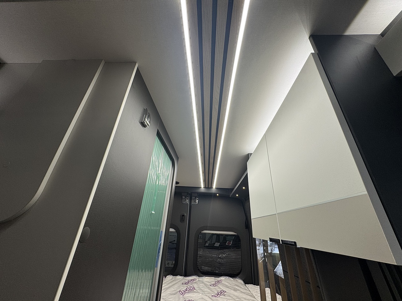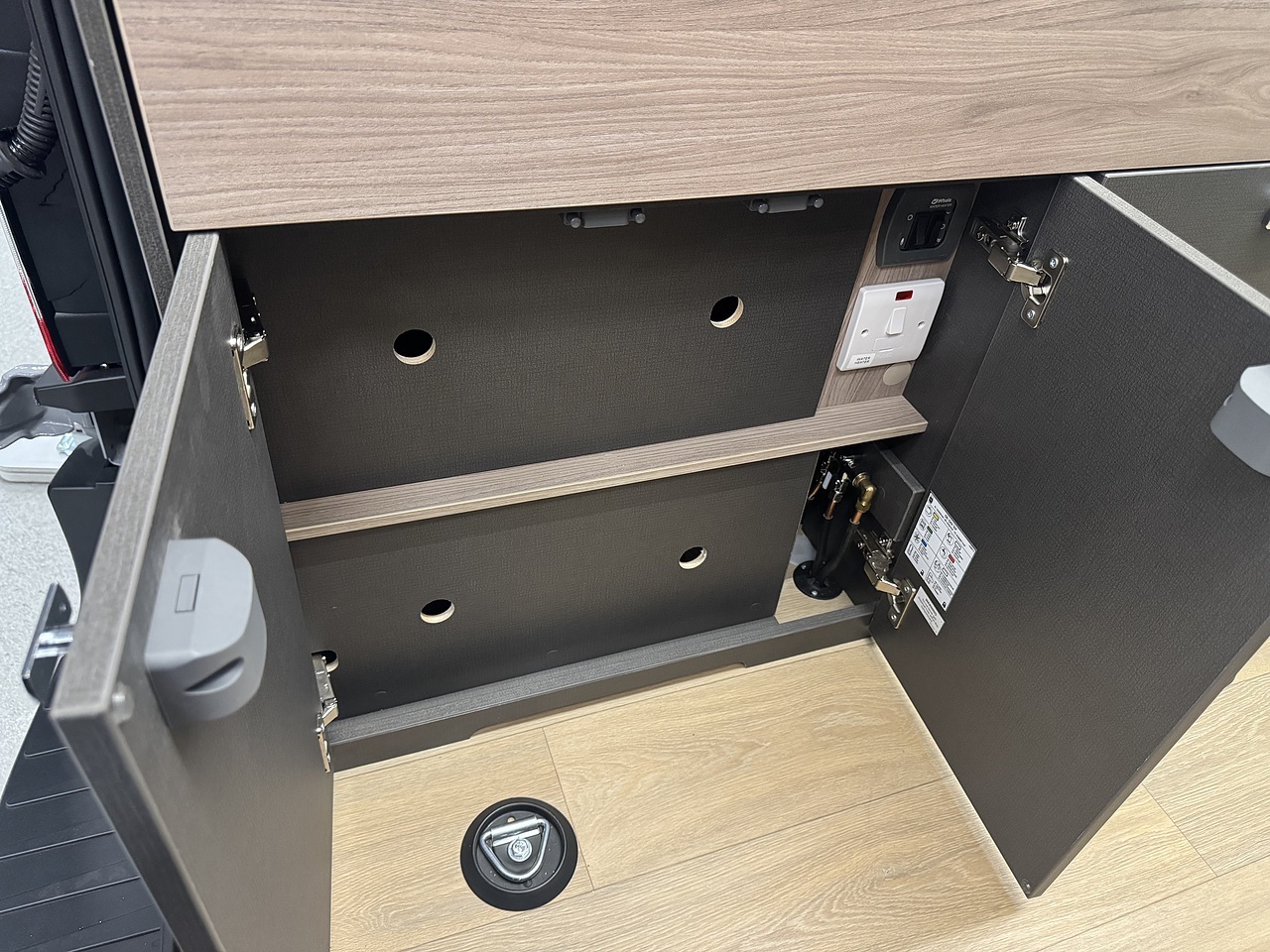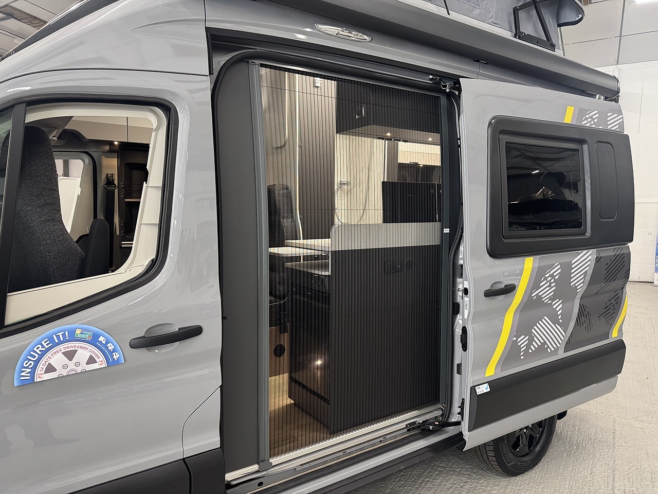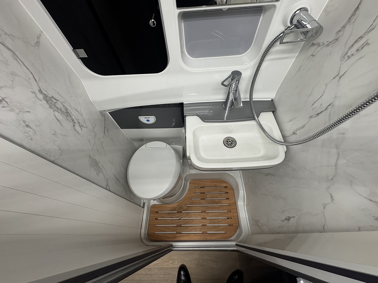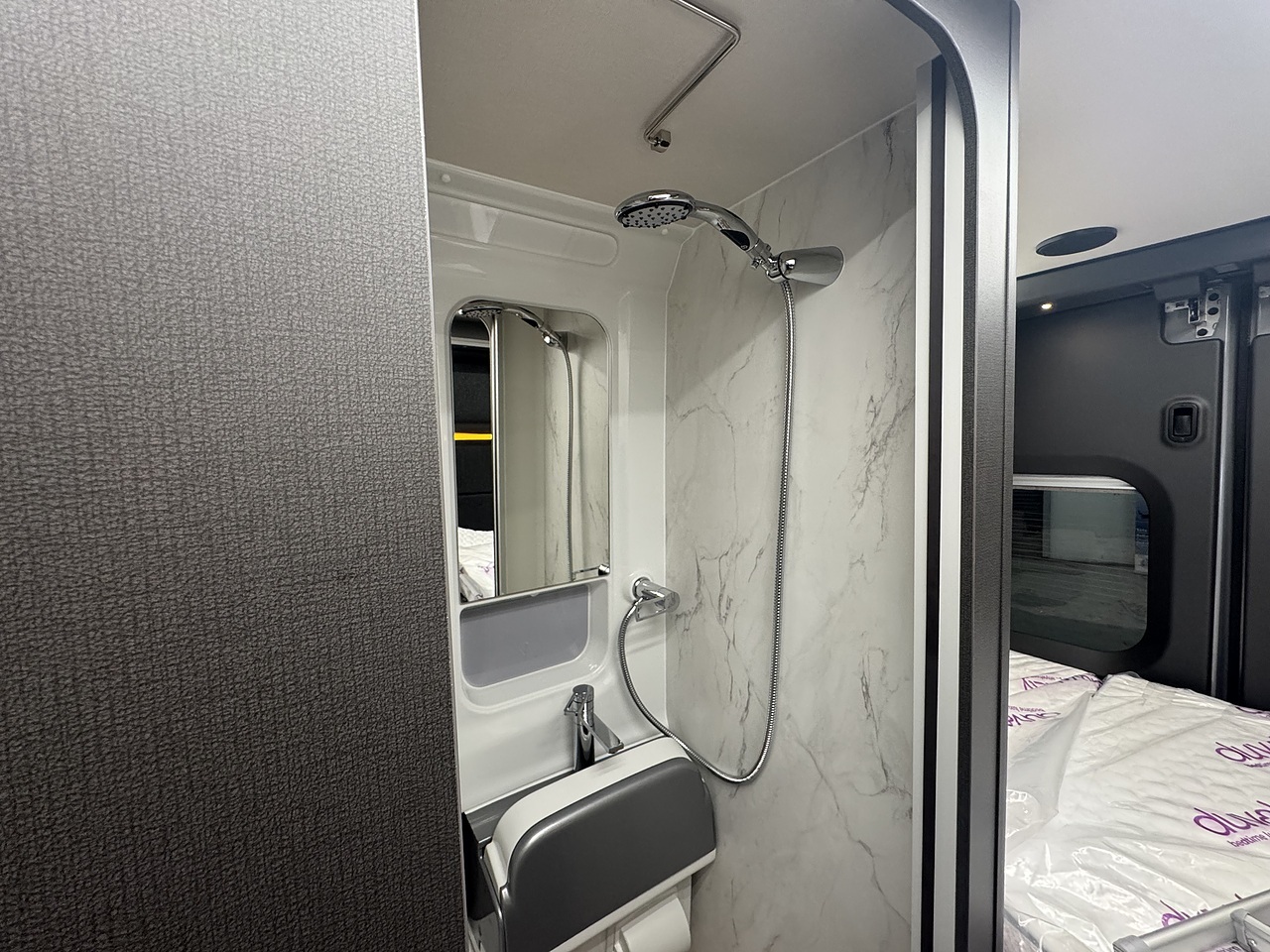 Opposite the kitchen sits the cleverly designed washroom which makes superb use of space. It features a swivel toilet, fold down basin and shower tray so you can make the most out of the space in such a compact van conversion.