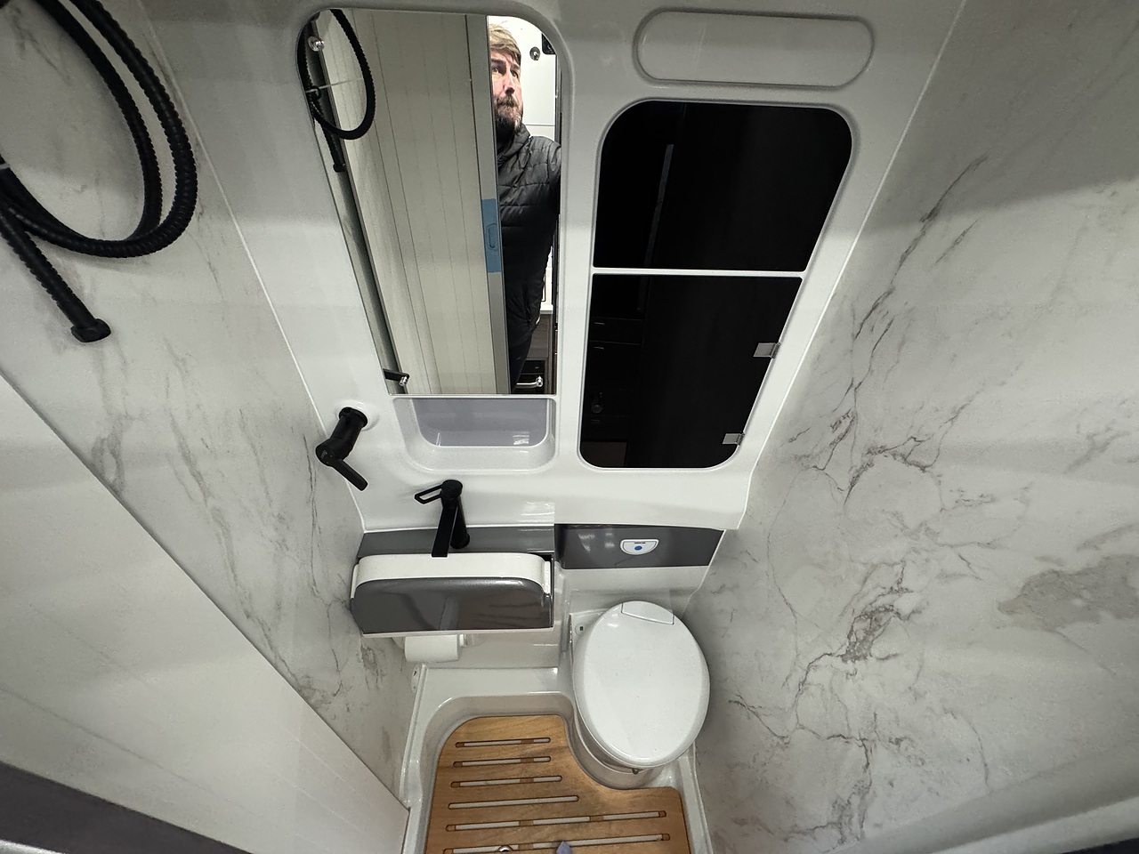 The washroom offers a modern finish with a separate shower and toilet arrangement, giving you real home from home convenience while travelling.