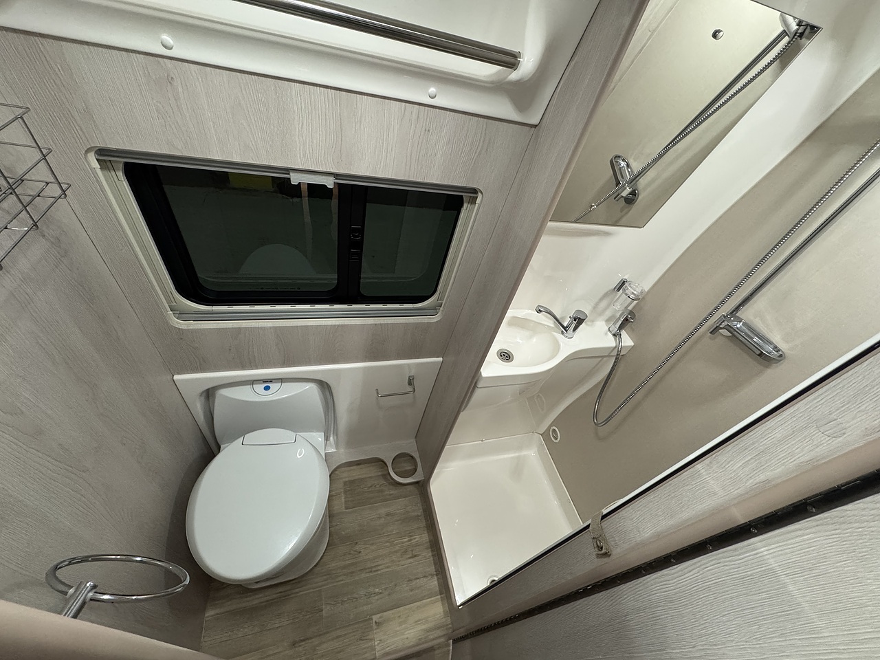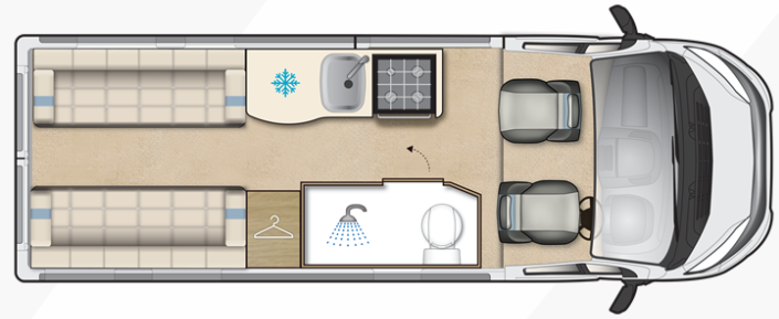 Opposite the kitchen sits the washroom, impressively spacious for a van conversion. With its modern vanity unit, swivel toilet and fully enclosed shower, it provides complete comfort and convenience on the road. Auto-Sleeper’s craftsmanship is clear in every fixture and finish, offering a boutique-style bathroom experience.