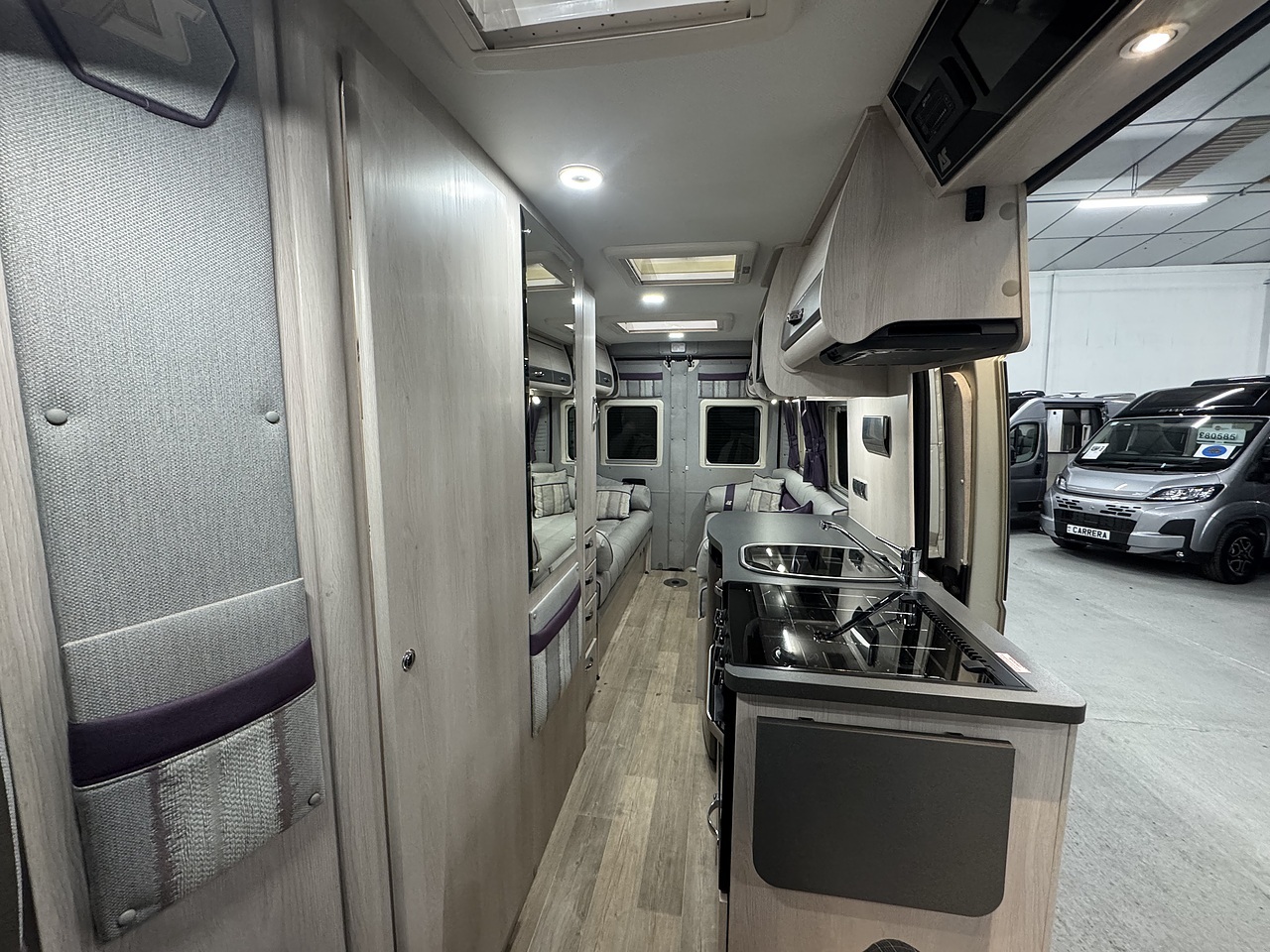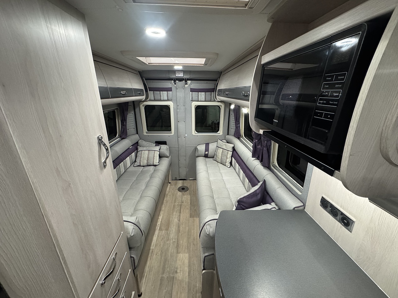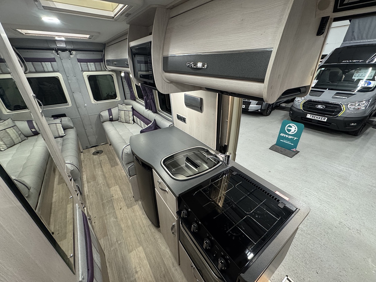 Stepping through the sliding door, you’re welcomed into a bright, elegant and impeccably finished living space. Immediately to your left is the fully equipped kitchen, a standout feature in the Warwick XL. It offers a premium cooking environment with a full oven and grill, three-burner hob, microwave and a large fridge, making proper meal preparation effortless. High-quality worktops, elegant cabinetry and subtle LED lighting give the kitchen a truly high-end feel.