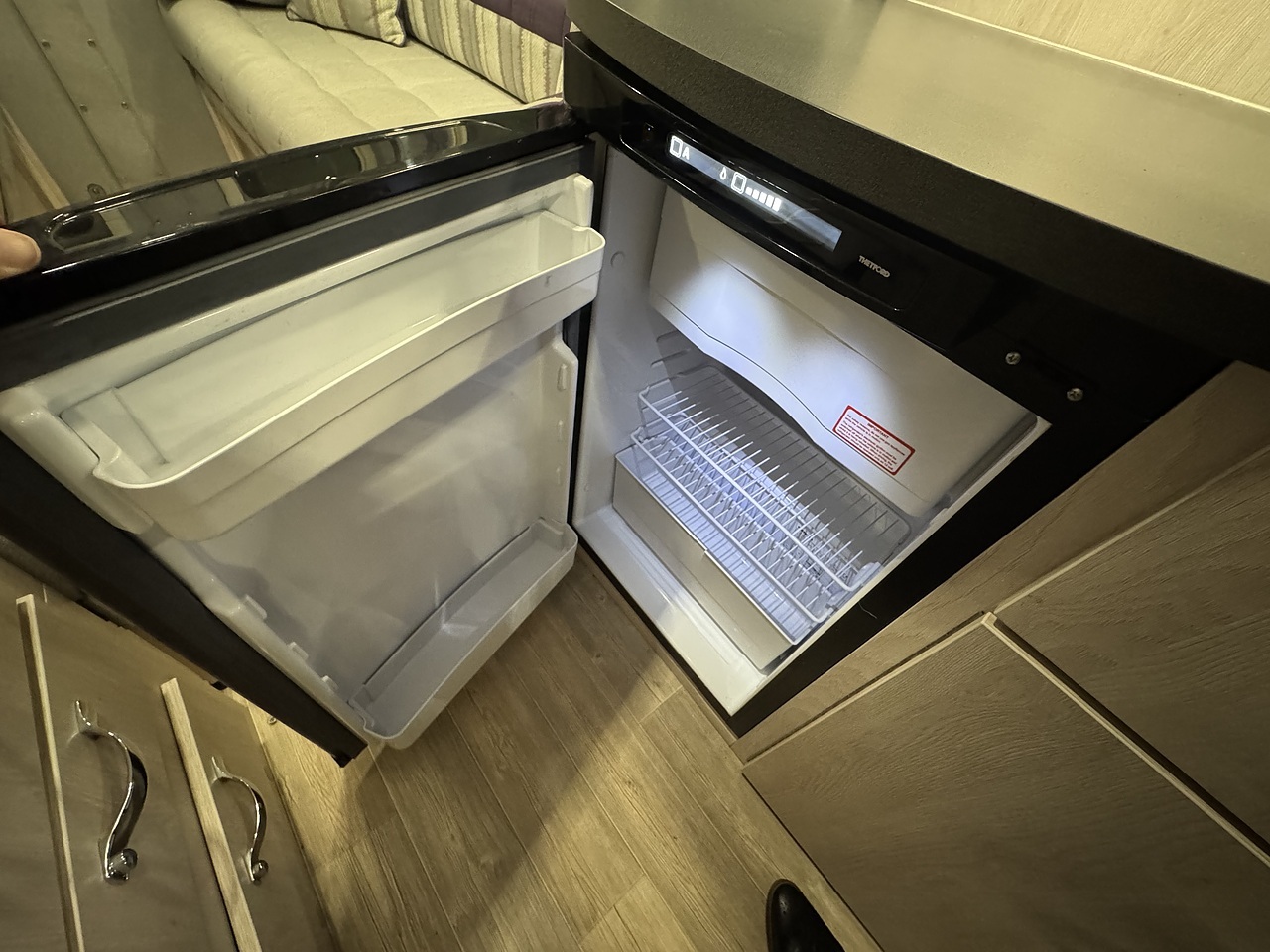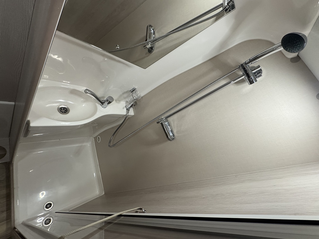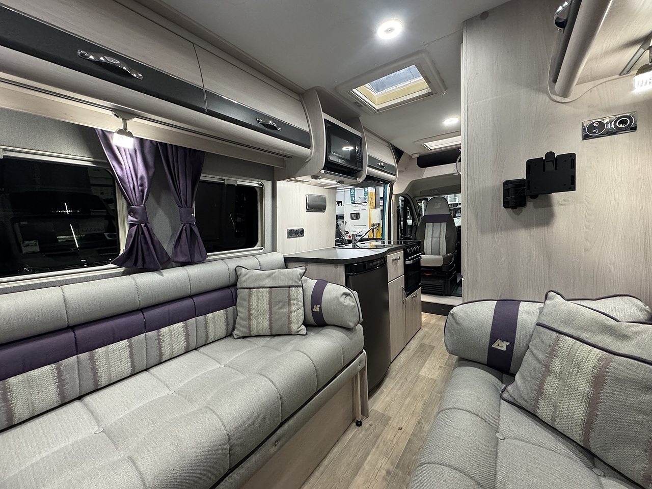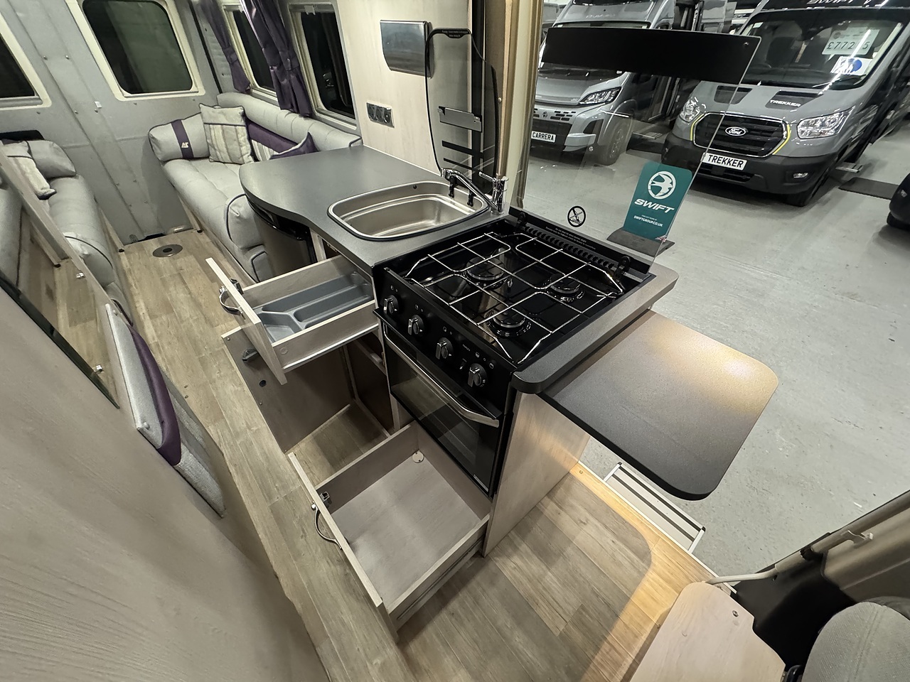 Stepping through the sliding door, you’re welcomed into a bright, elegant and impeccably finished living space. Immediately to your left is the fully equipped kitchen, a standout feature in the Warwick XL. It offers a premium cooking environment with a full oven and grill, three-burner hob, microwave and a large fridge, making proper meal preparation effortless. High-quality worktops, elegant cabinetry and subtle LED lighting give the kitchen a truly high-end feel.