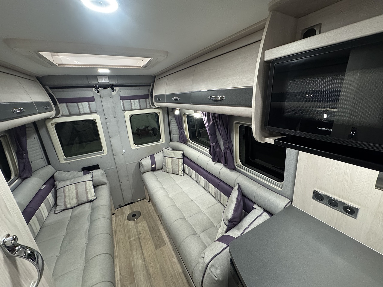 As you move further towards the rear, you enter the heart of the Warwick XL, the iconic rear lounge. This area is where the luxury truly shines. The wrap-around seating delivers outstanding comfort, upholstered in premium fabrics with deep cushioning that invites you to relax and unwind. Large side windows and a rear window fill the lounge with natural light, while the rooflight above enhances the open, airy atmosphere. Whether you’re reading, dining, entertaining or simply enjoying the view, the lounge feels spacious, refined and incredibly inviting.