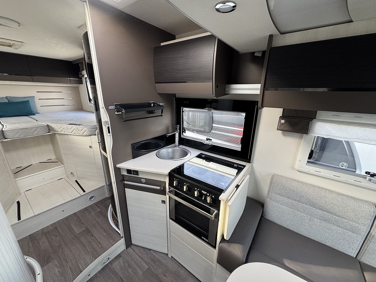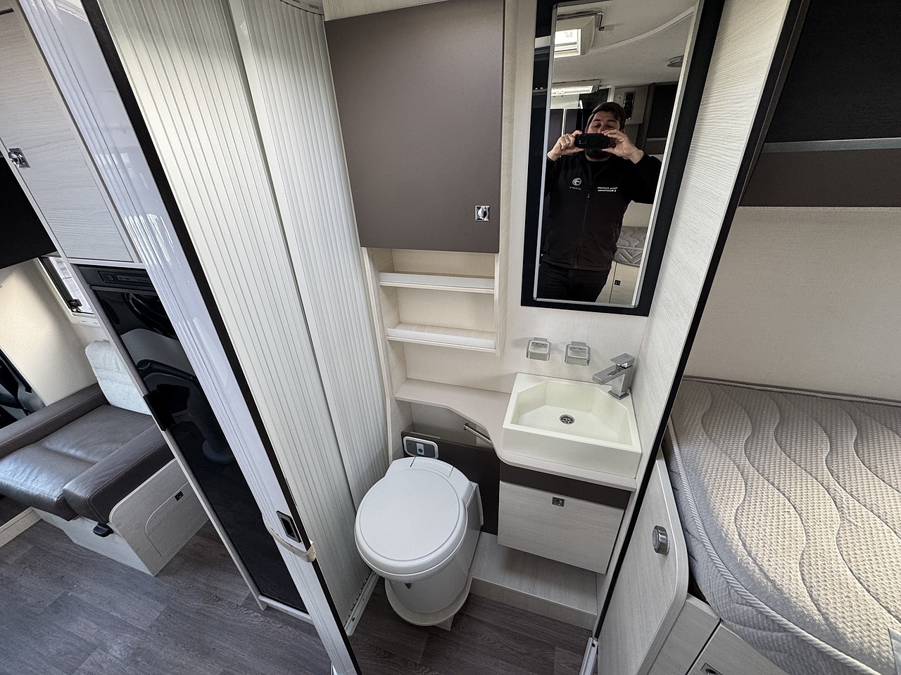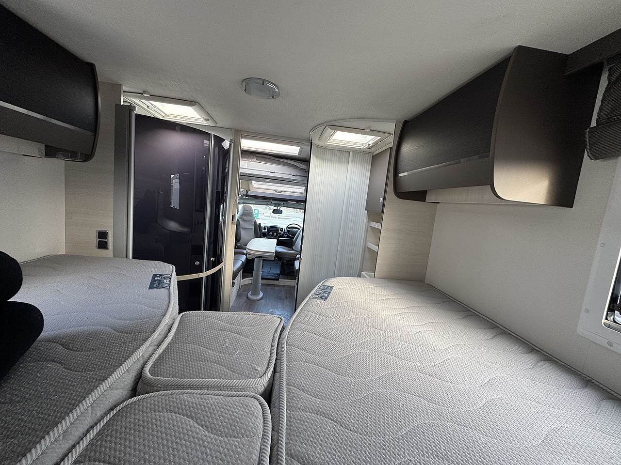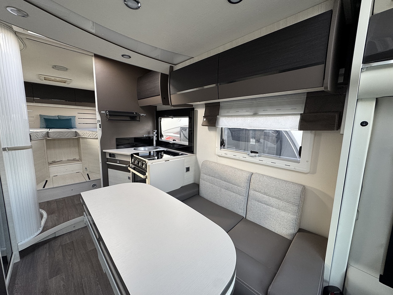 Opposite sits the washroom and separate shower area, finished in a modern style and offering excellent privacy. The design allows the rear bedroom to be closed off from the rest of the motorhome, creating a true en-suite feel.