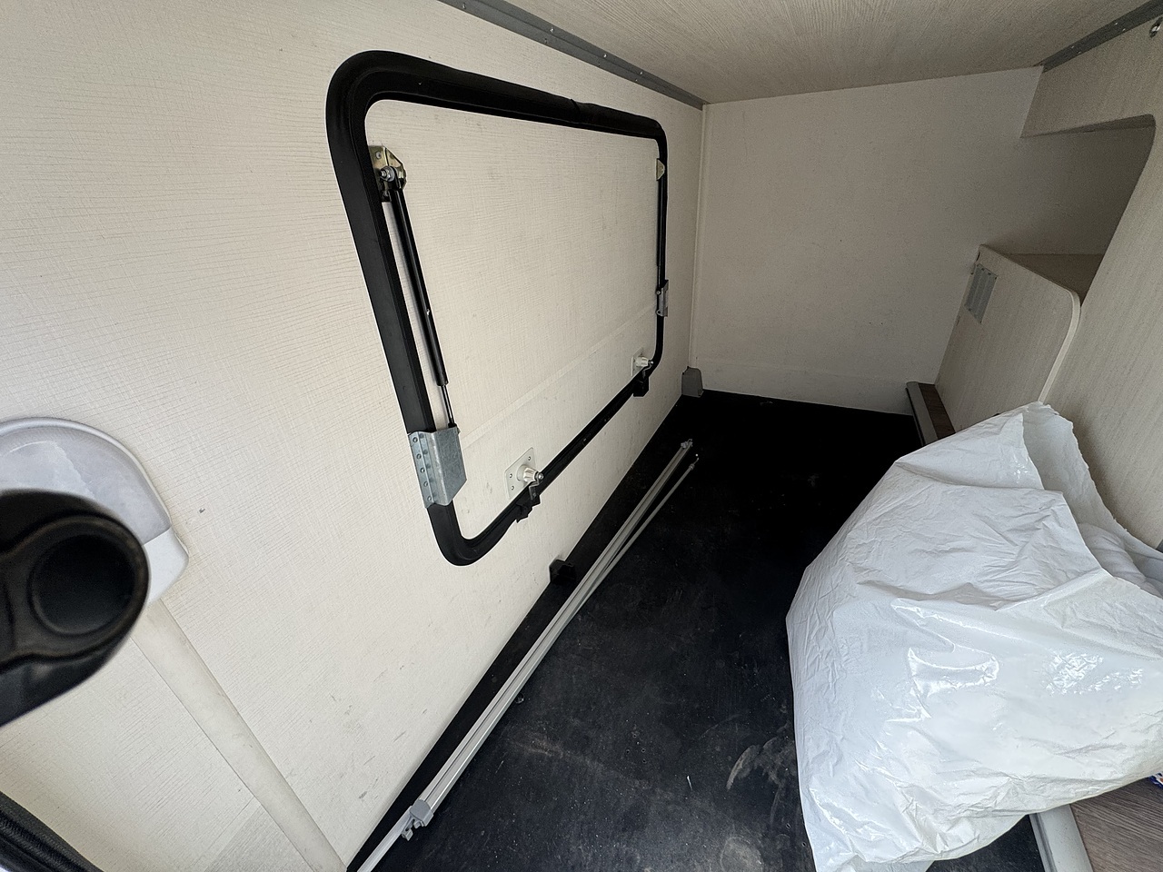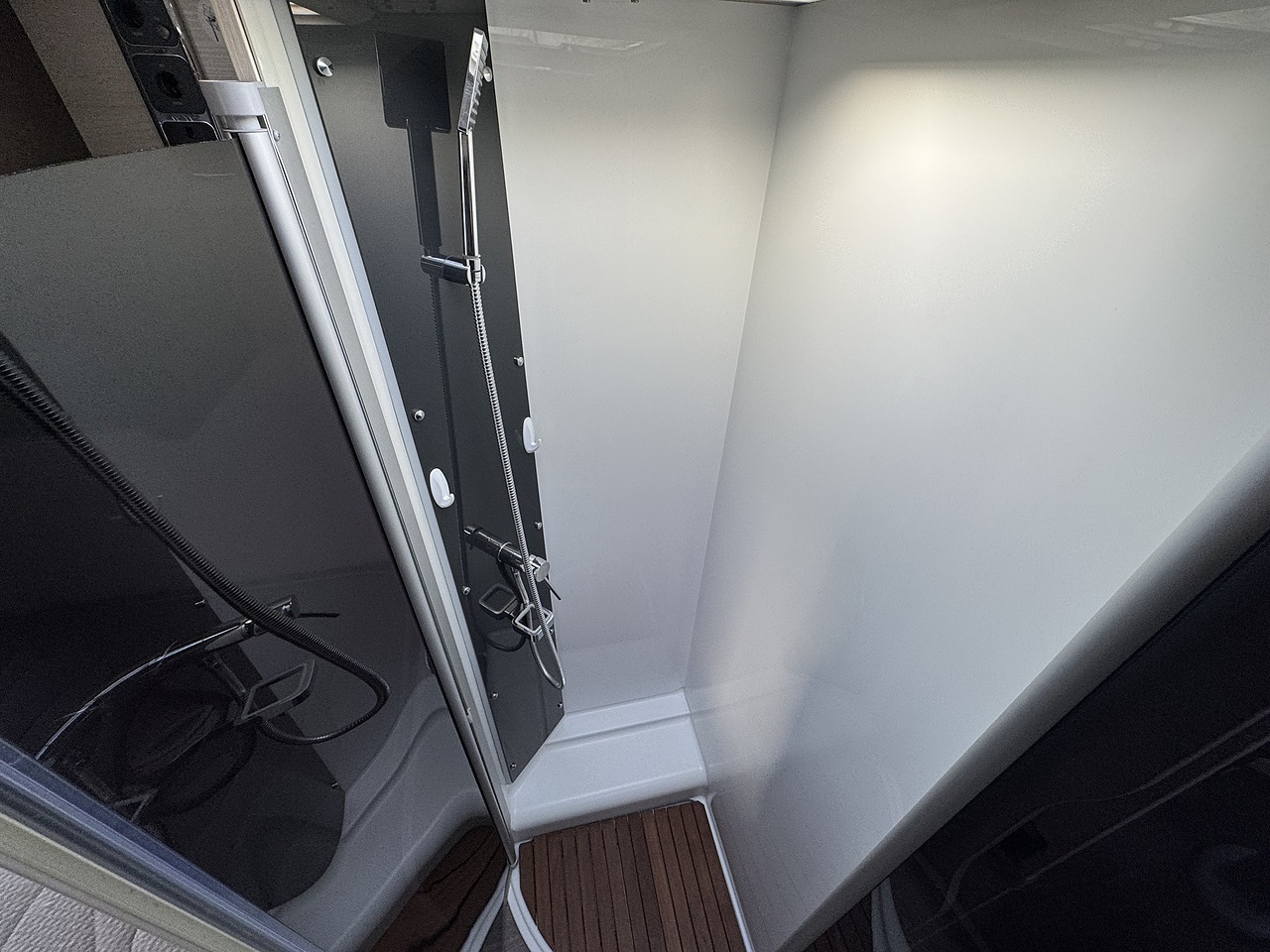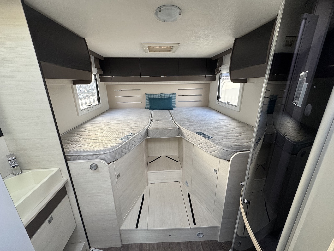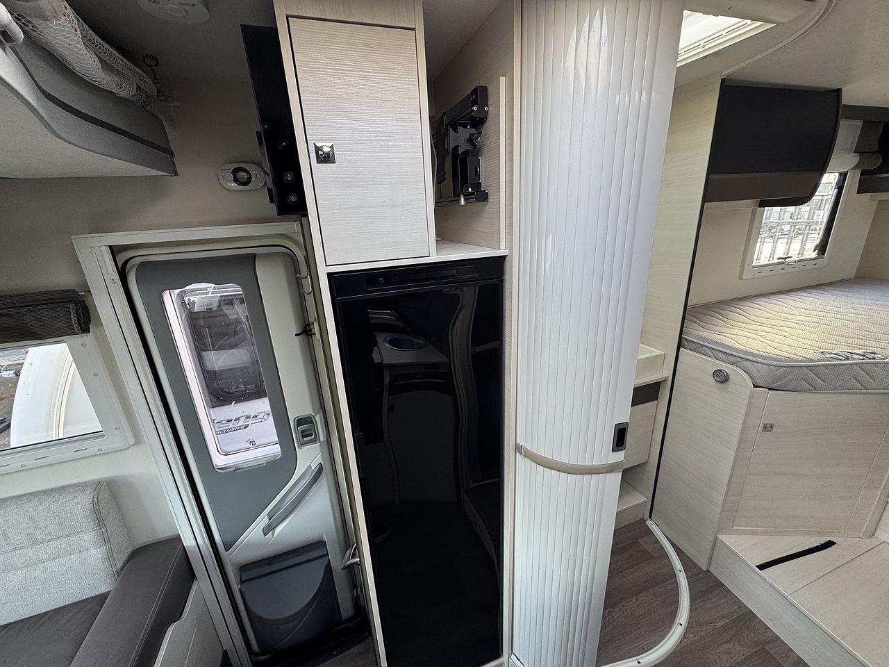 Opposite sits the washroom and separate shower area, finished in a modern style and offering excellent privacy. The design allows the rear bedroom to be closed off from the rest of the motorhome, creating a true en-suite feel.