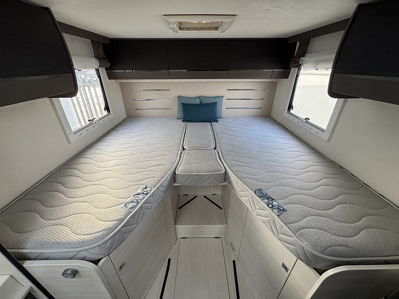 At the rear, the 747GA really stands out with its twin single beds. These provide comfortable sleeping and can also be adapted to form a large double if preferred. Beneath the beds is the signature garage storage area, accessible from both sides externally – perfect for bikes, outdoor furniture or all your holiday equipment.