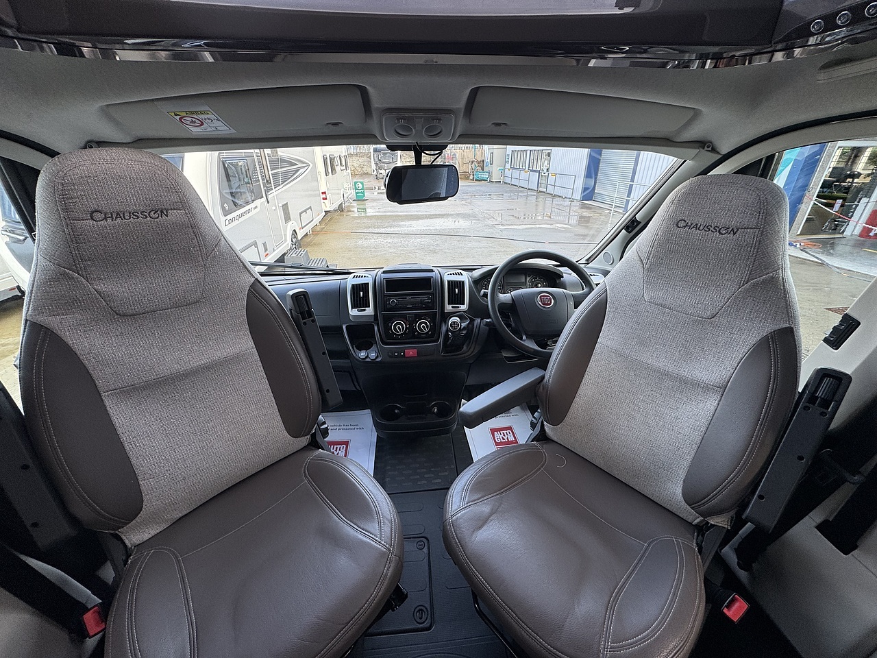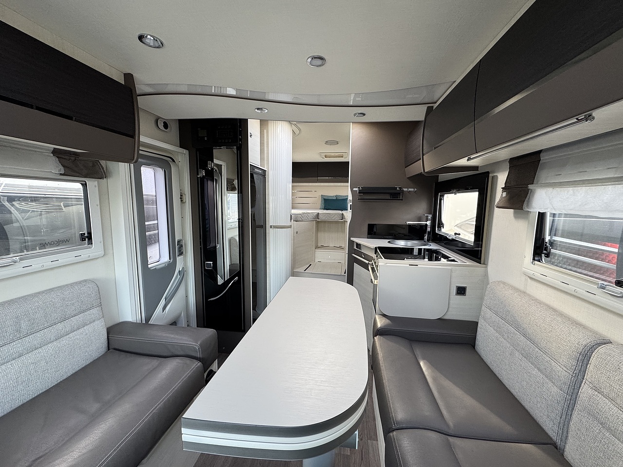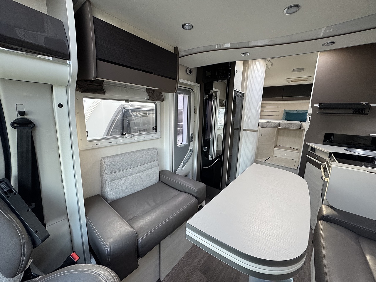 Entering through the habitation door, you step into a bright and sociable front lounge. The swivel captain seats integrate perfectly with the living area, creating a relaxed space for dining or unwinding. Large side windows and an overhead skylight allow natural light to flood in, giving the motorhome a real sense of openness and comfort.