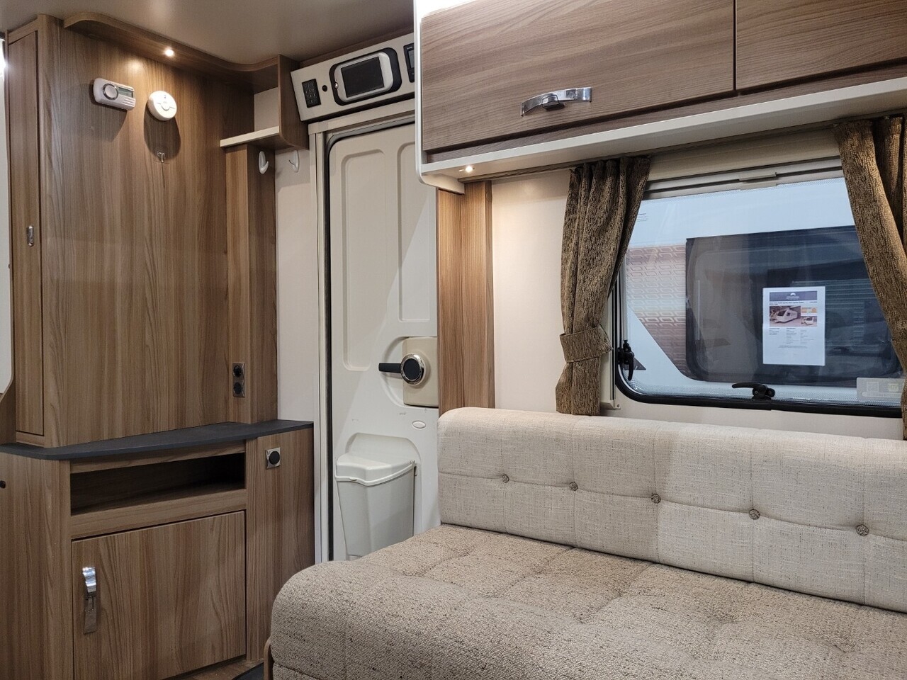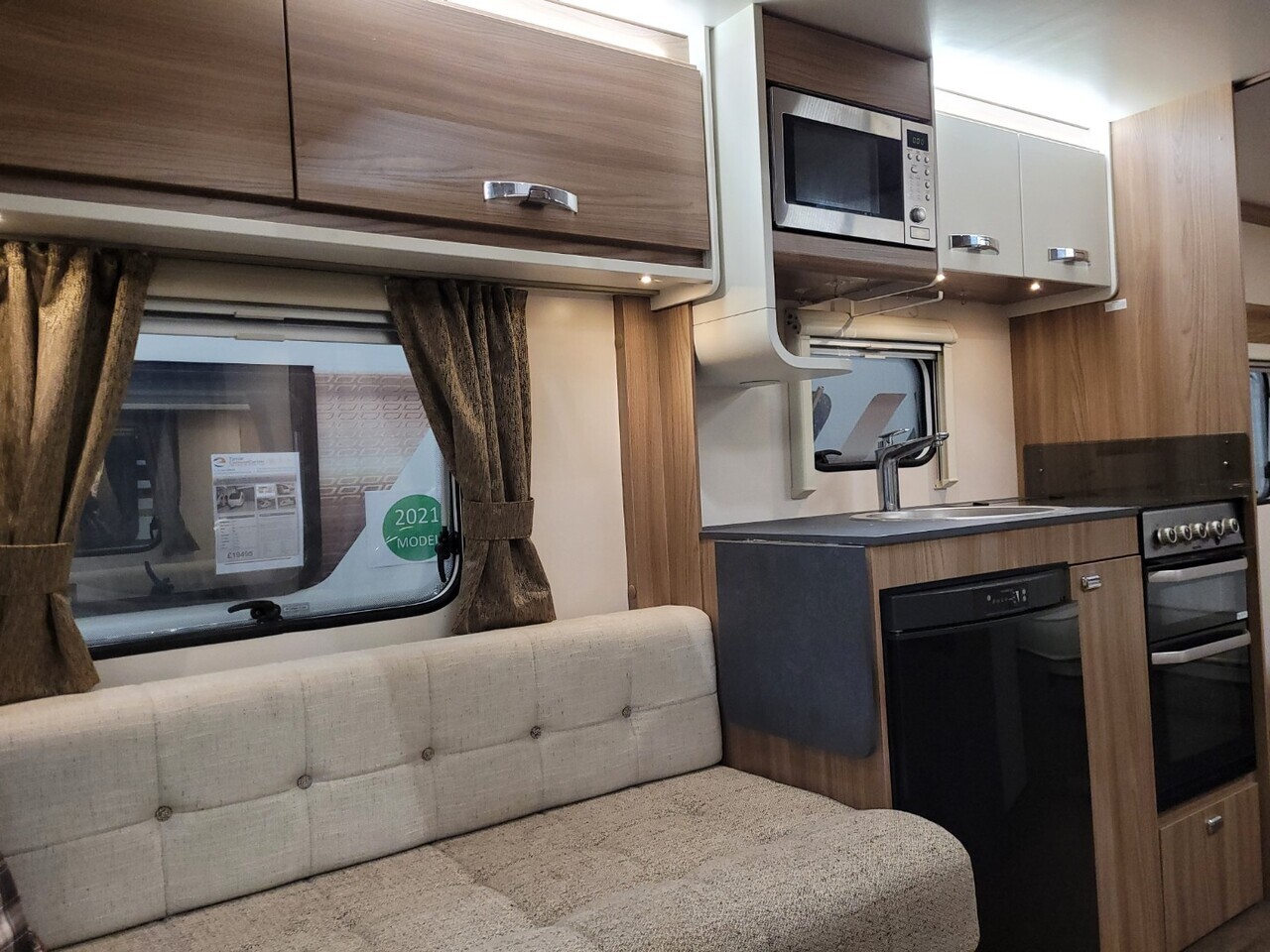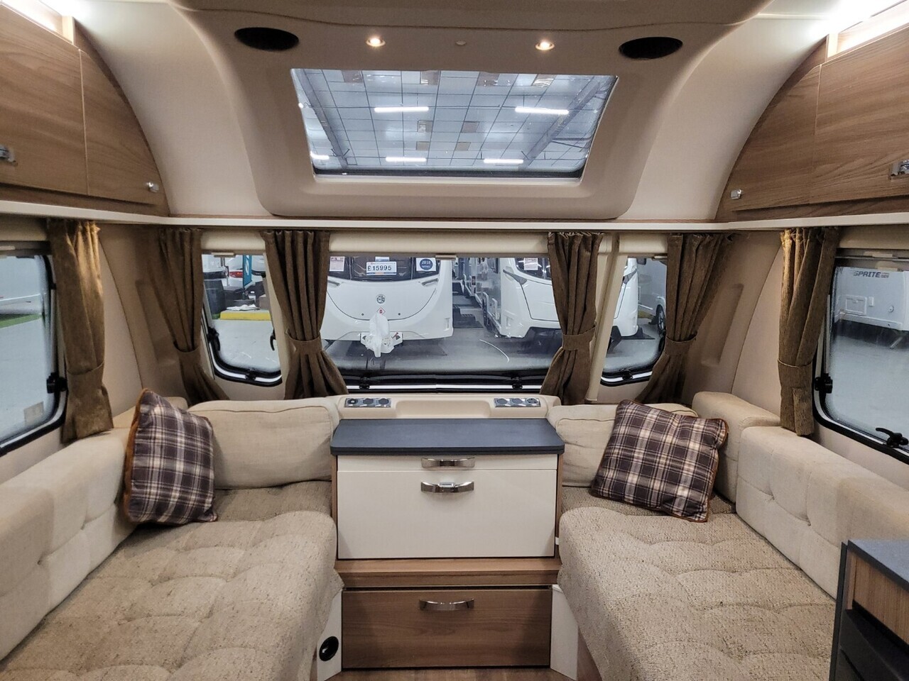 At the front of the caravan, there are two comfortable parallel seats that create a bright and inviting lounge area. These seats easily convert into a large double bed when required. The large front windows and overhead rooflight allow plenty of natural light to fill the space, giving it a warm and airy atmosphere.