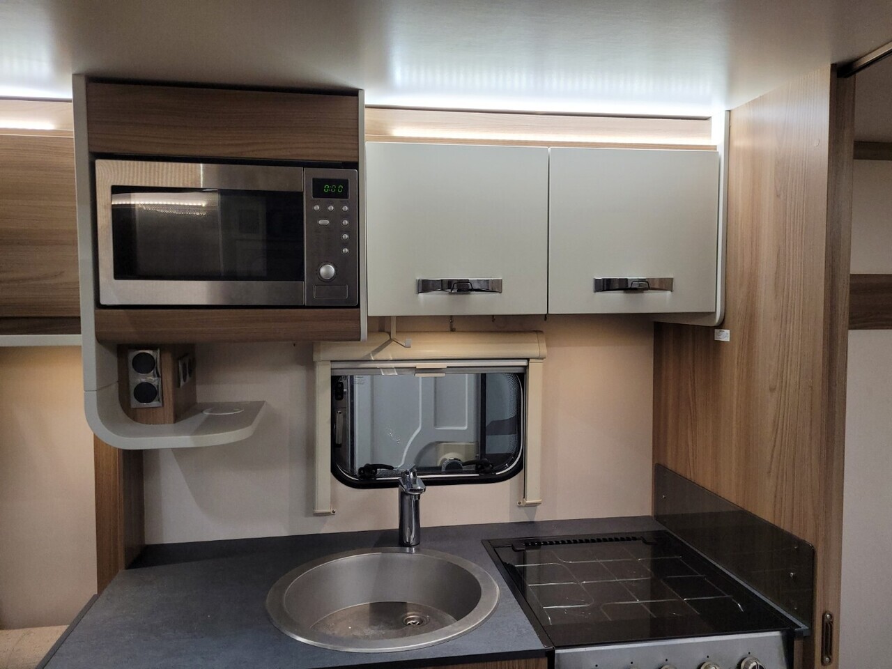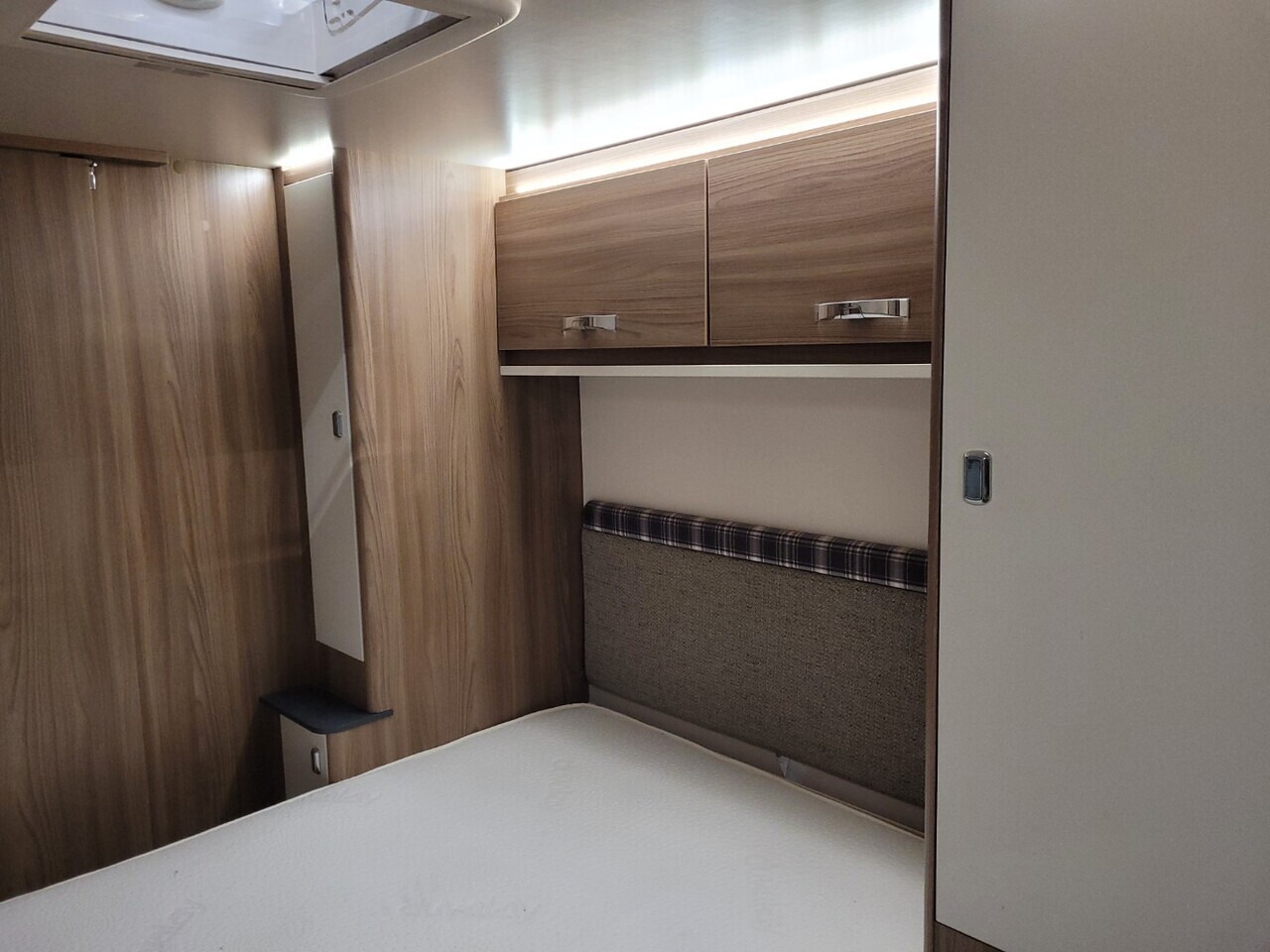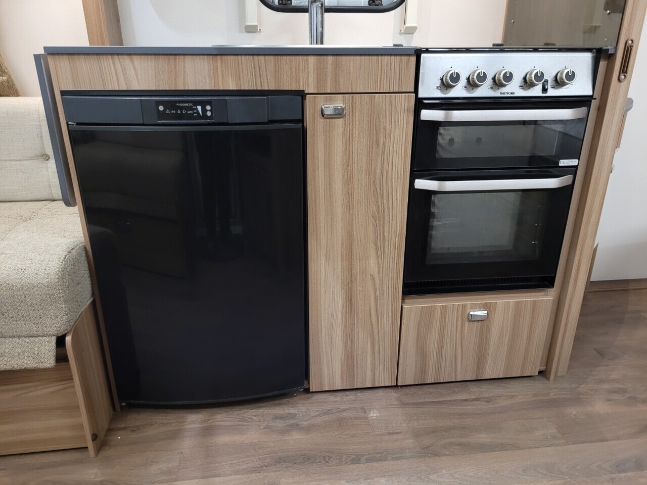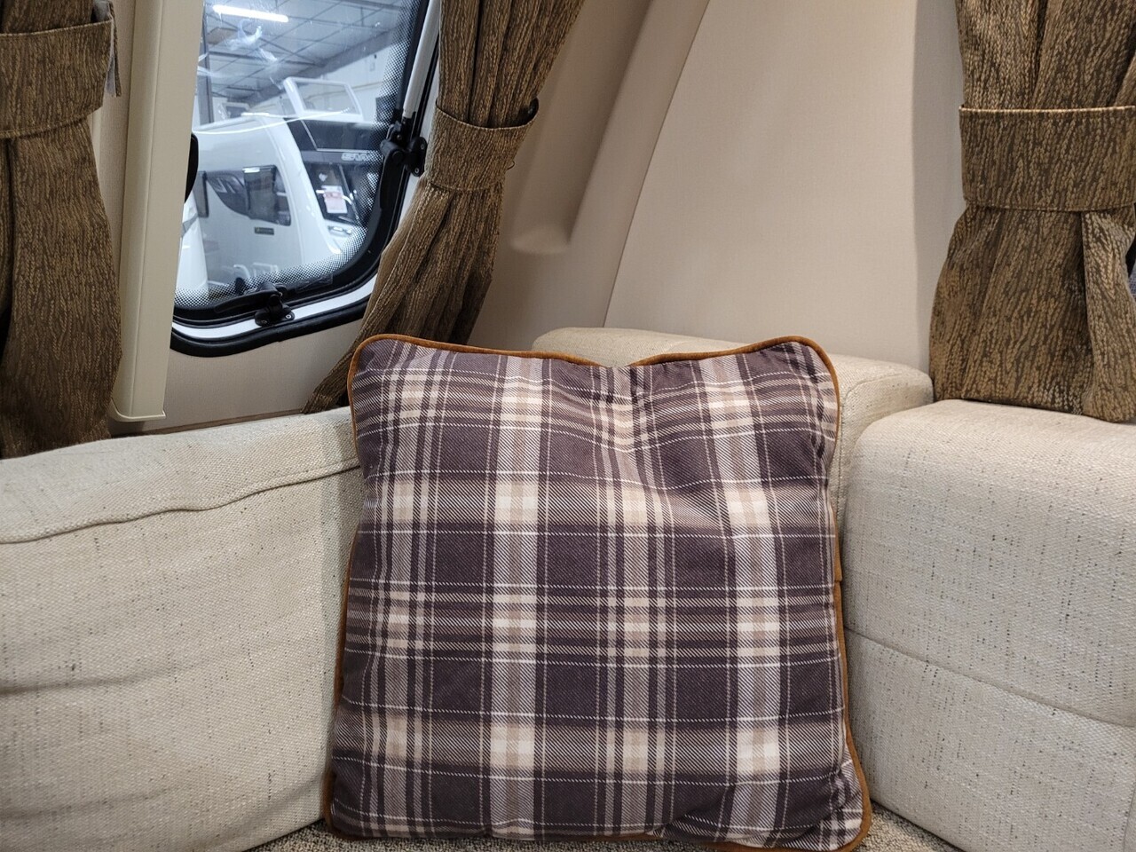 At the front of the caravan, there are two comfortable parallel seats that create a bright and inviting lounge area. These seats easily convert into a large double bed when required. The large front windows and overhead rooflight allow plenty of natural light to fill the space, giving it a warm and airy atmosphere.