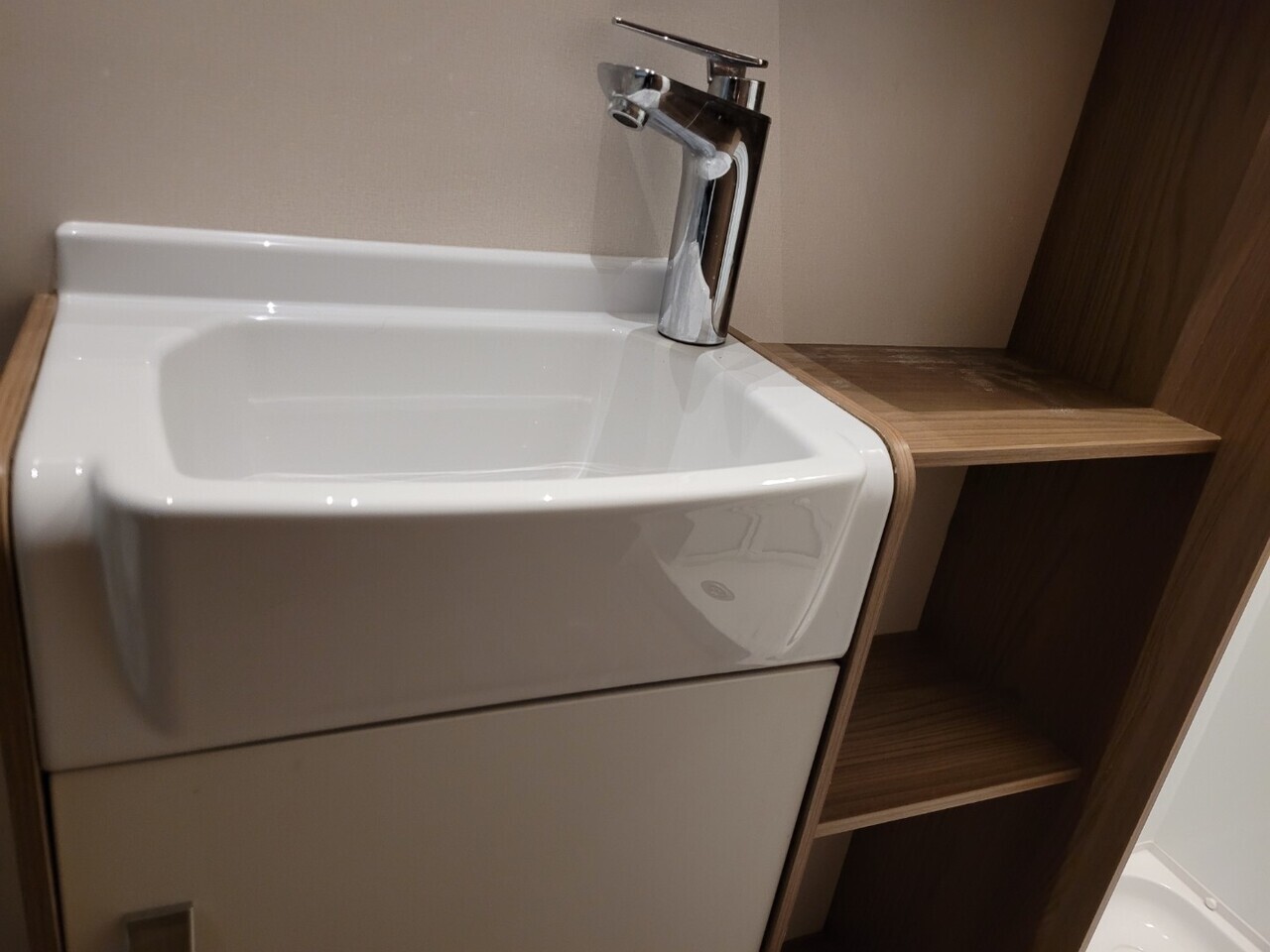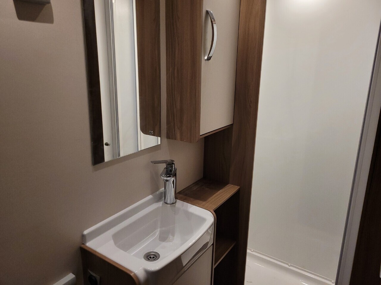 Towards the rear, the transverse island bed provides a comfortable and relaxing place to unwind after a day of exploring. The bed extends at night with an insert cushion to offer extra sleeping space, and there are wardrobes and overhead lockers for clothing and personal items At the very back of the caravan is the full width washroom, which includes a toilet, wash basin, and a separate walk-in shower cubicle.