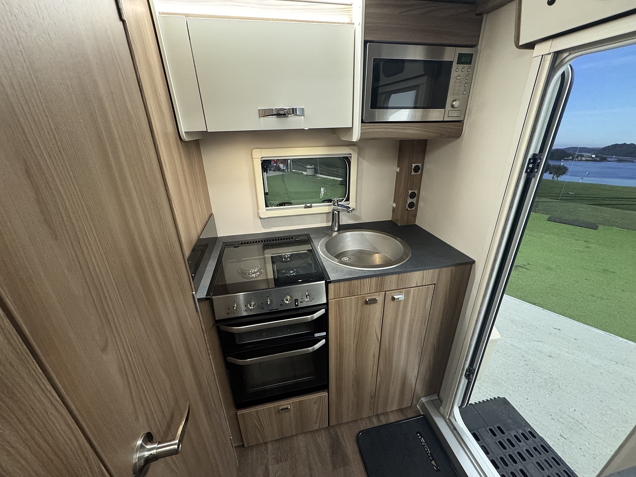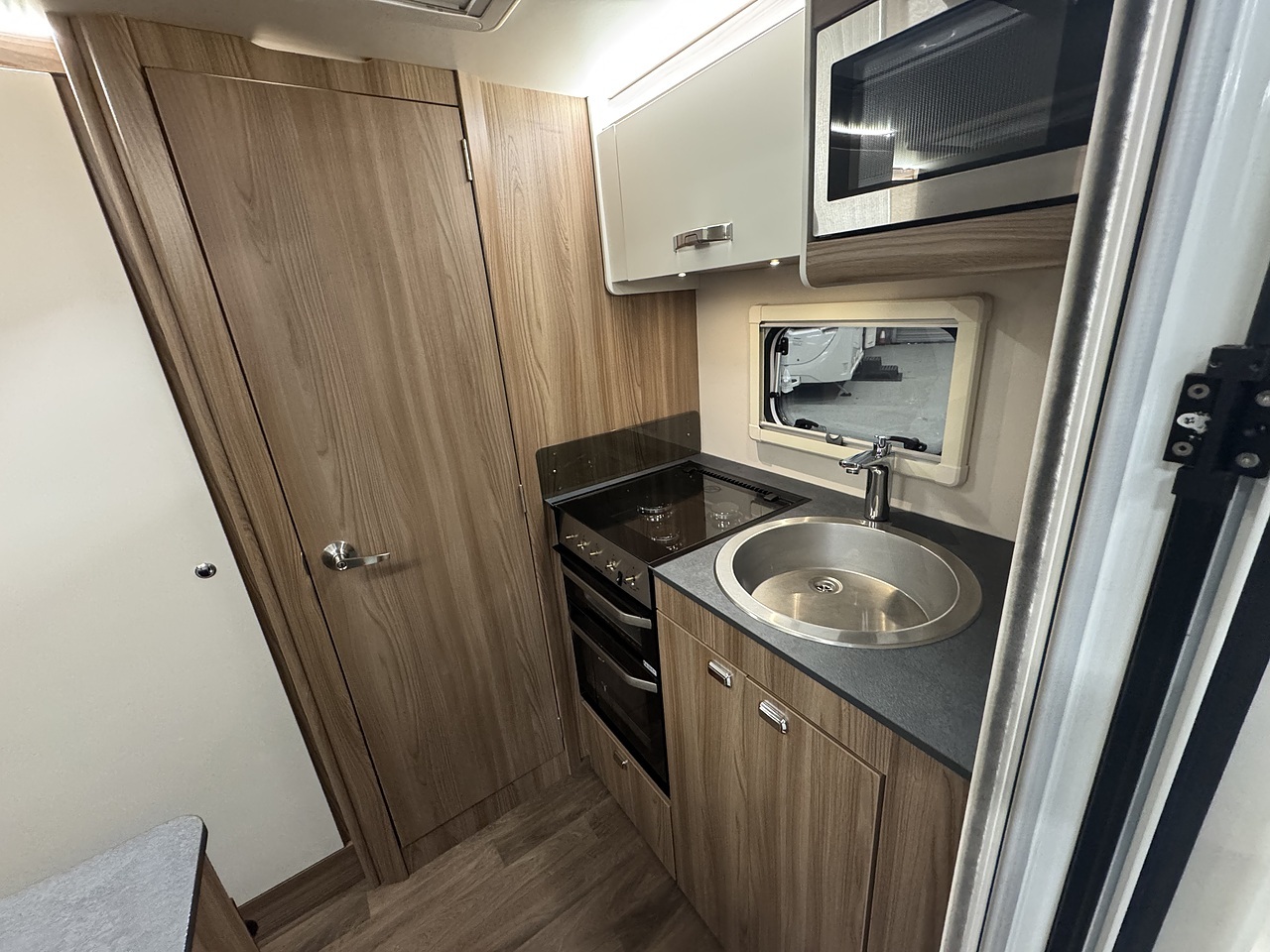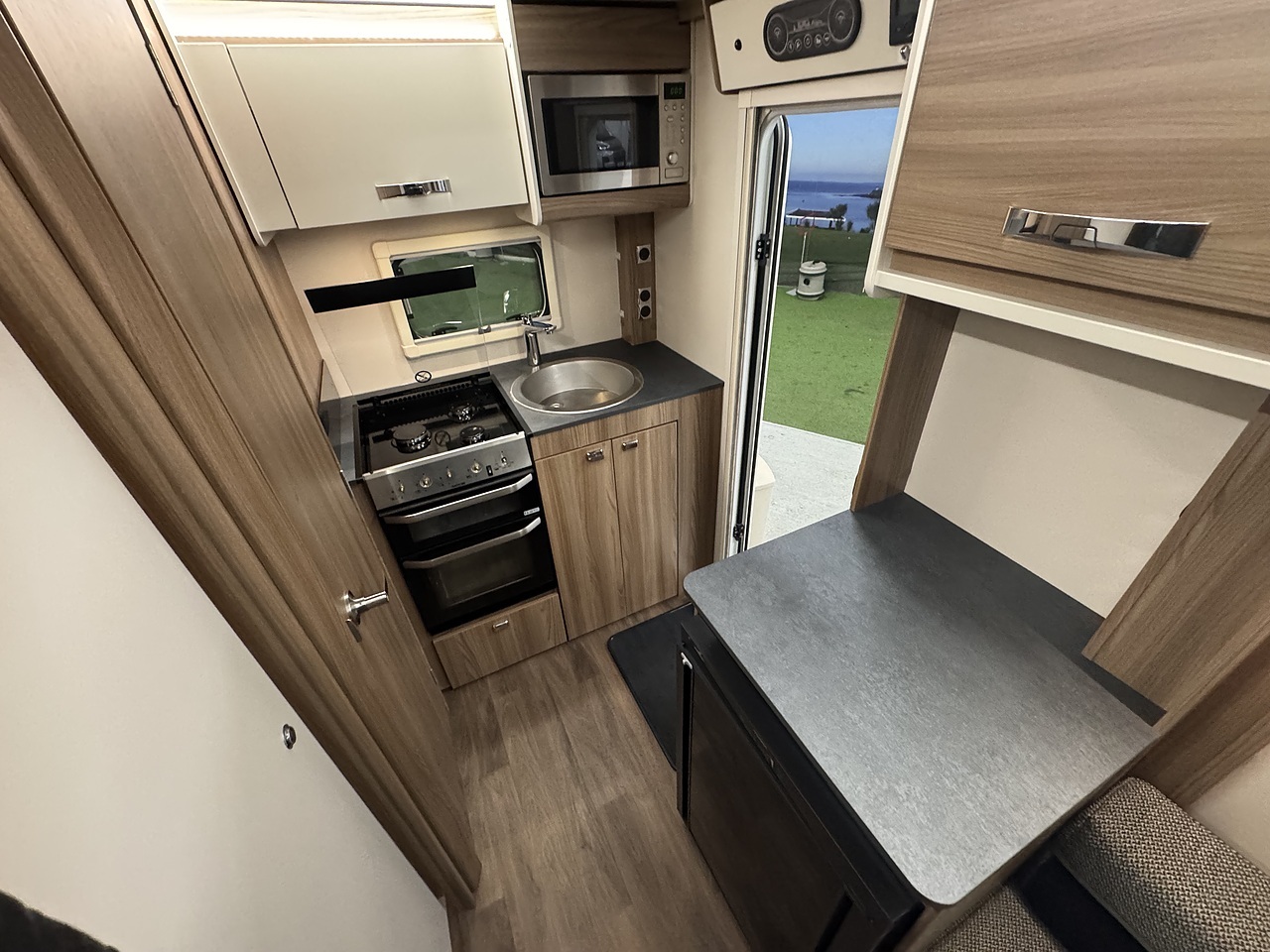 At the rear is the kitchen area, equipped with everything you need for your adventures. It includes a gas oven and grill, gas hob, microwave, and a kitchen sink with a lovely window view, so you can enjoy the scenery while cooking or washing up. Adacent to the kichen area you have the washroom which located to in the rear corner. That includes toilet, shower, and wash basin all in one convenient space perfect for compact touring without compromising comfort.