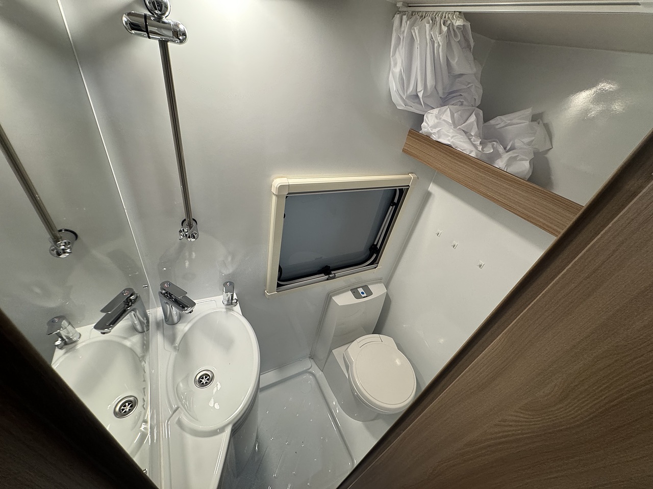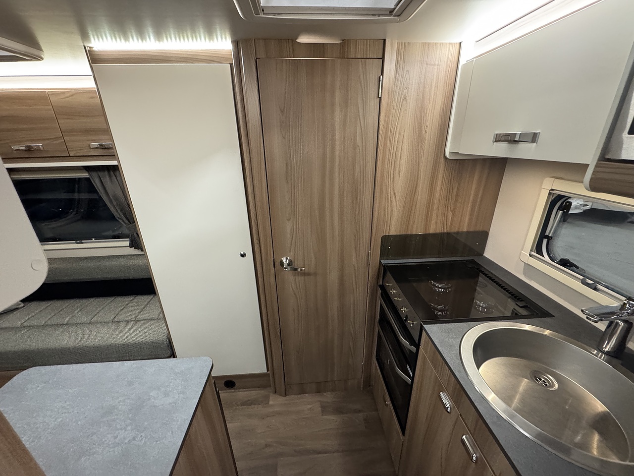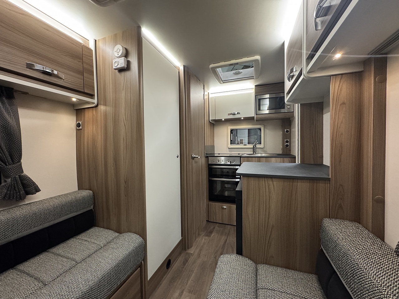 At the rear is the kitchen area, equipped with everything you need for your adventures. It includes a gas oven and grill, gas hob, microwave, and a kitchen sink with a lovely window view, so you can enjoy the scenery while cooking or washing up. Adacent to the kichen area you have the washroom which located to in the rear corner. That includes toilet, shower, and wash basin all in one convenient space perfect for compact touring without compromising comfort.