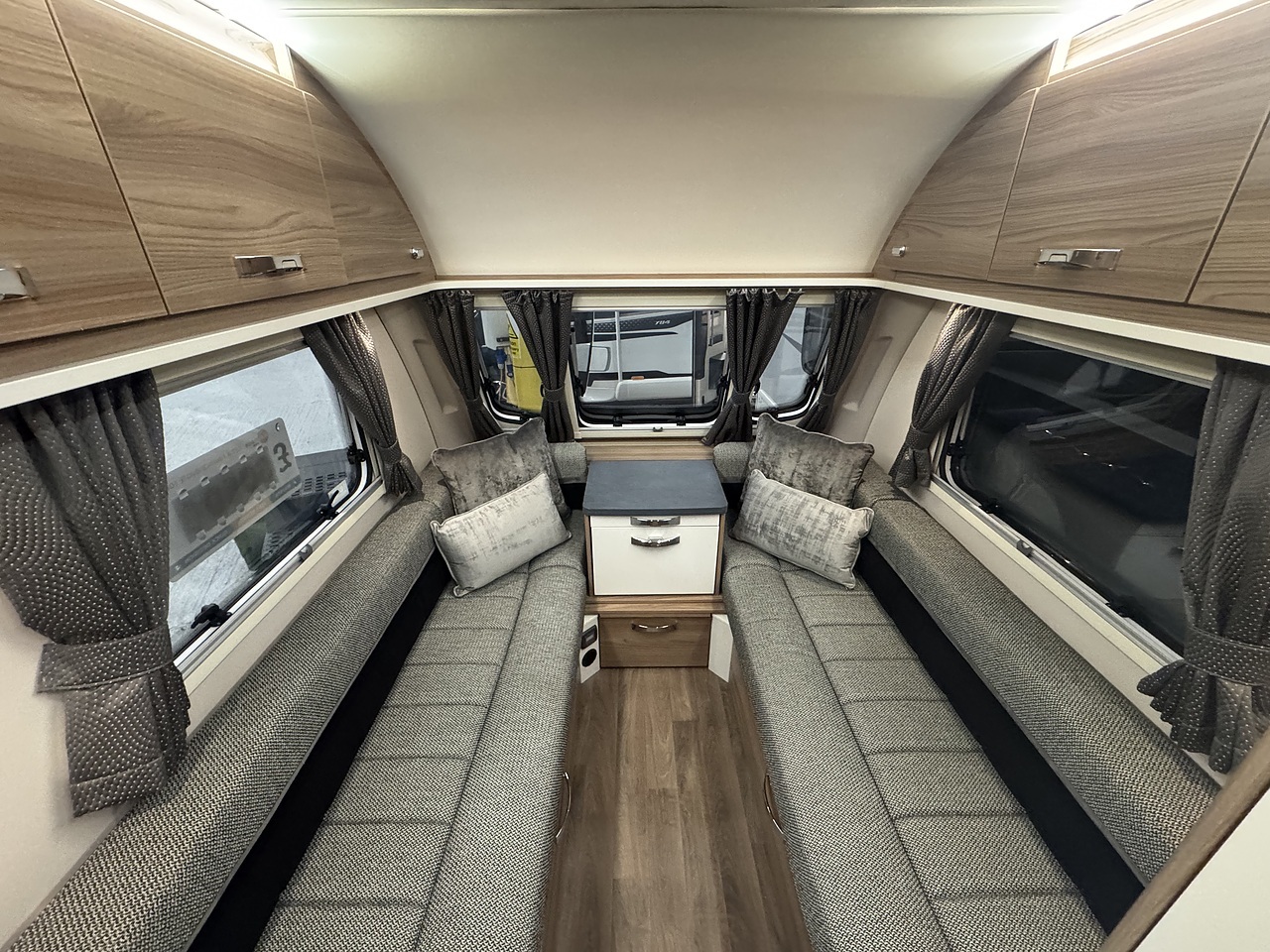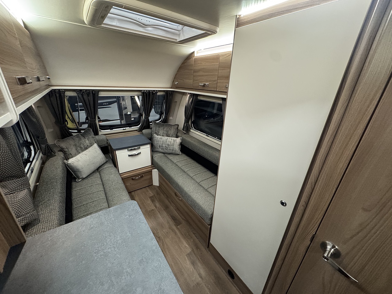 At the front of the caravan, there are two comfortable lounge seats that can be used as single beds or easily convert into a large double bed for a relaxing night’s sleep. Large front windows allow plenty of natural light to fill the living space, creating a bright and airy feel.