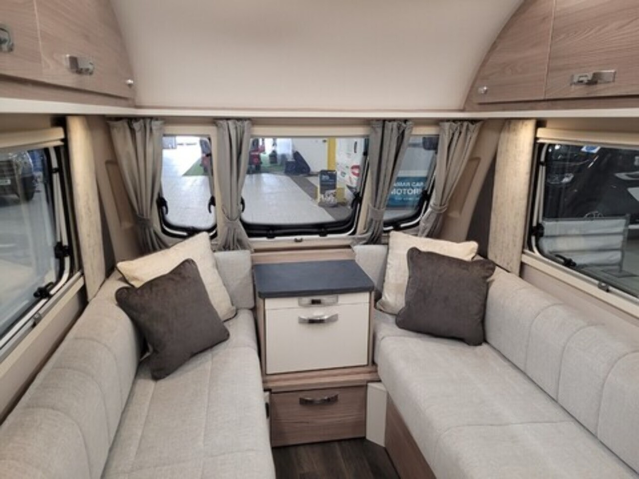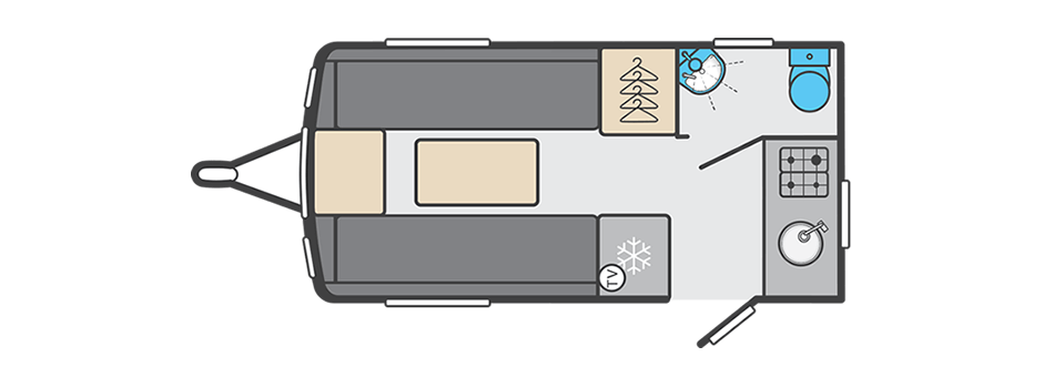 At the front of the caravan, there are two comfortable lounge seats that can be used as single beds or easily convert into a large double bed for a relaxing night’s sleep. Large front windows allow plenty of natural light to fill the living space, creating a bright and airy feel.
