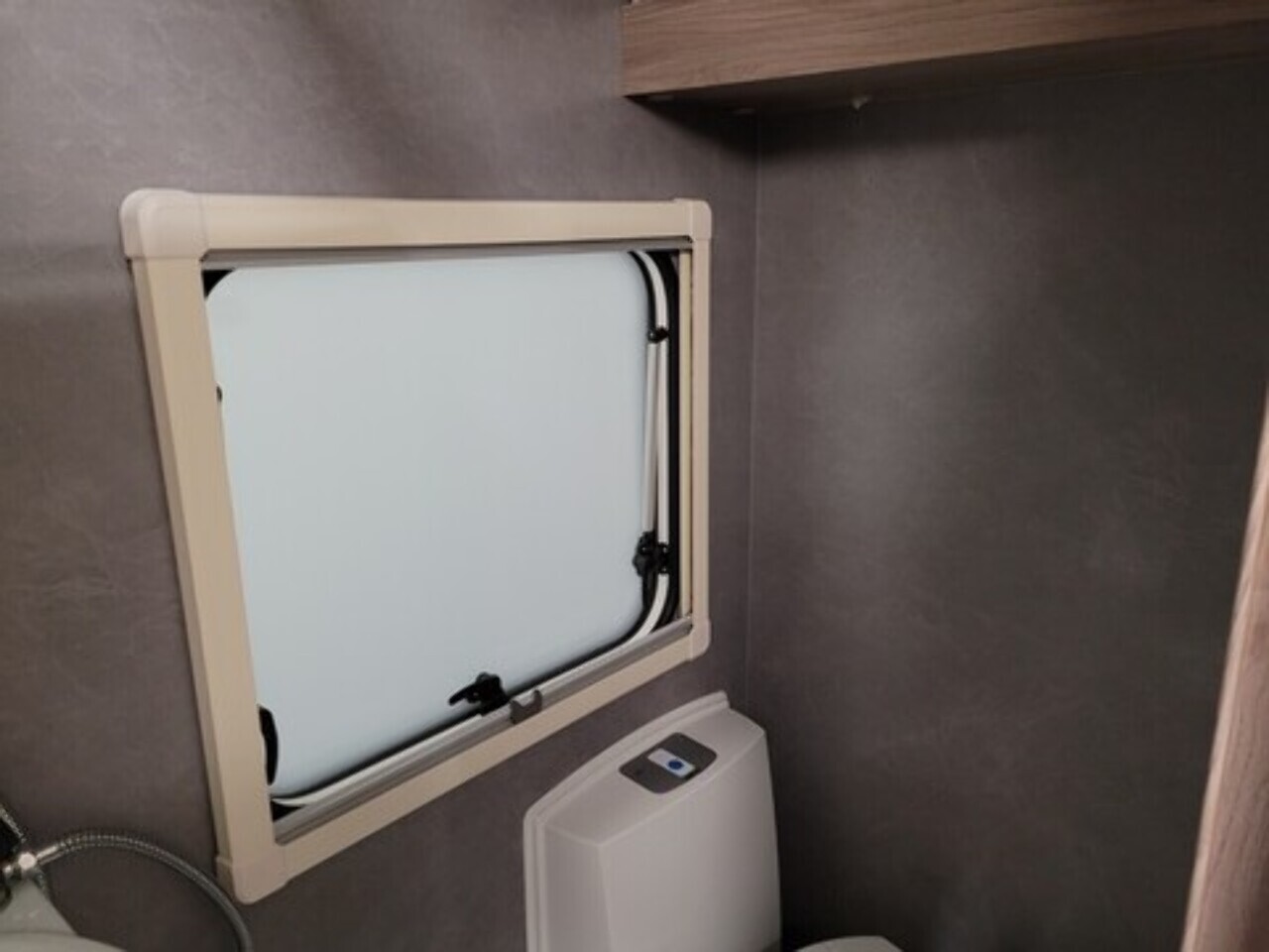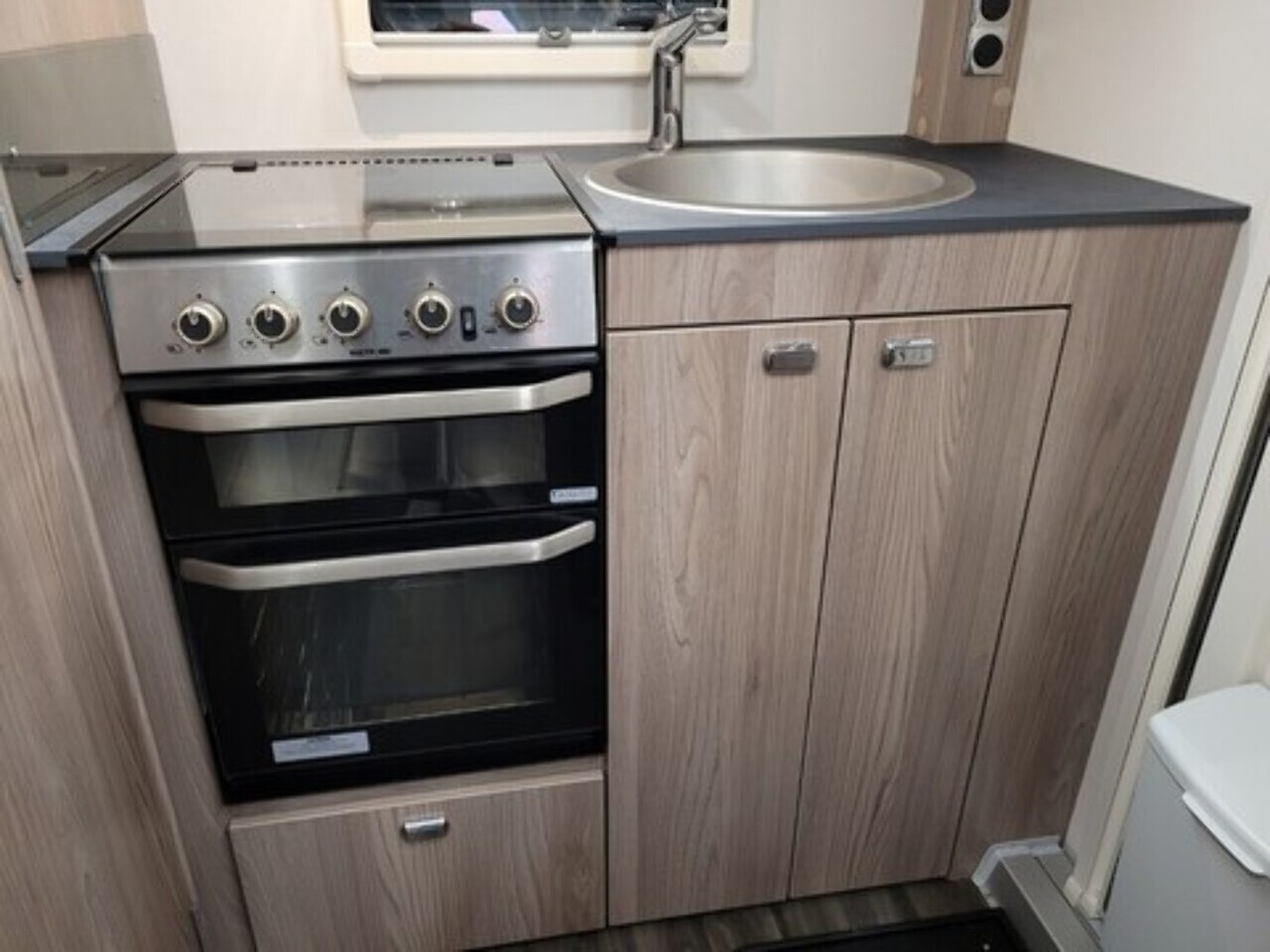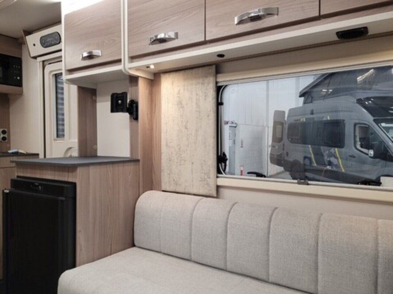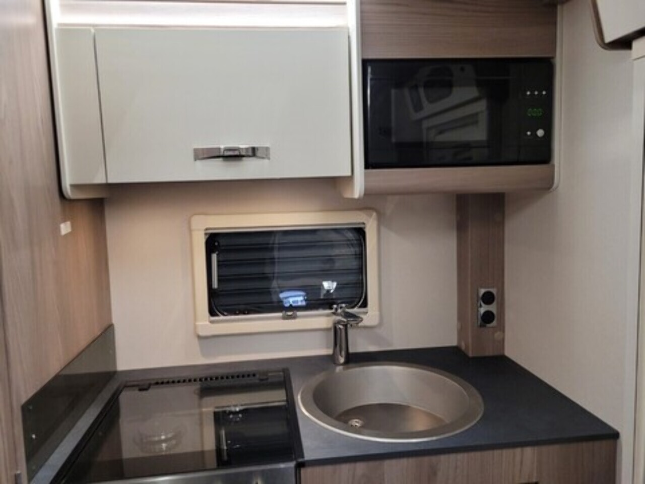 At the rear is the kitchen area, equipped with everything you need for your adventures. It includes a gas oven and grill, gas hob, microwave, and a kitchen sink with a lovely window view, so you can enjoy the scenery while cooking or washing up. Adacent to the kichen area you have the washroom which located to in the rear corner. That includes toilet, shower, and wash basin all in one convenient space perfect for compact touring without compromising comfort.