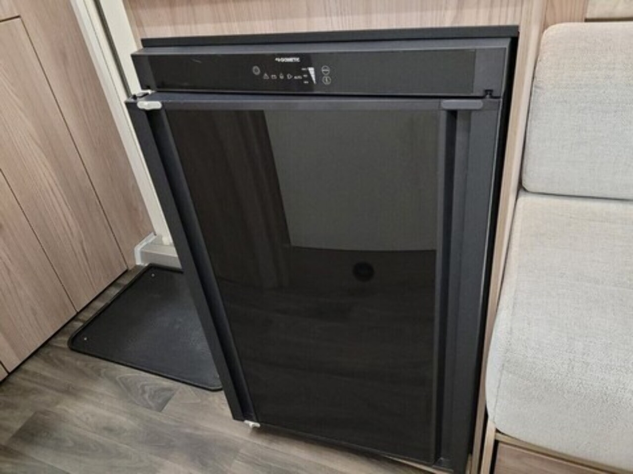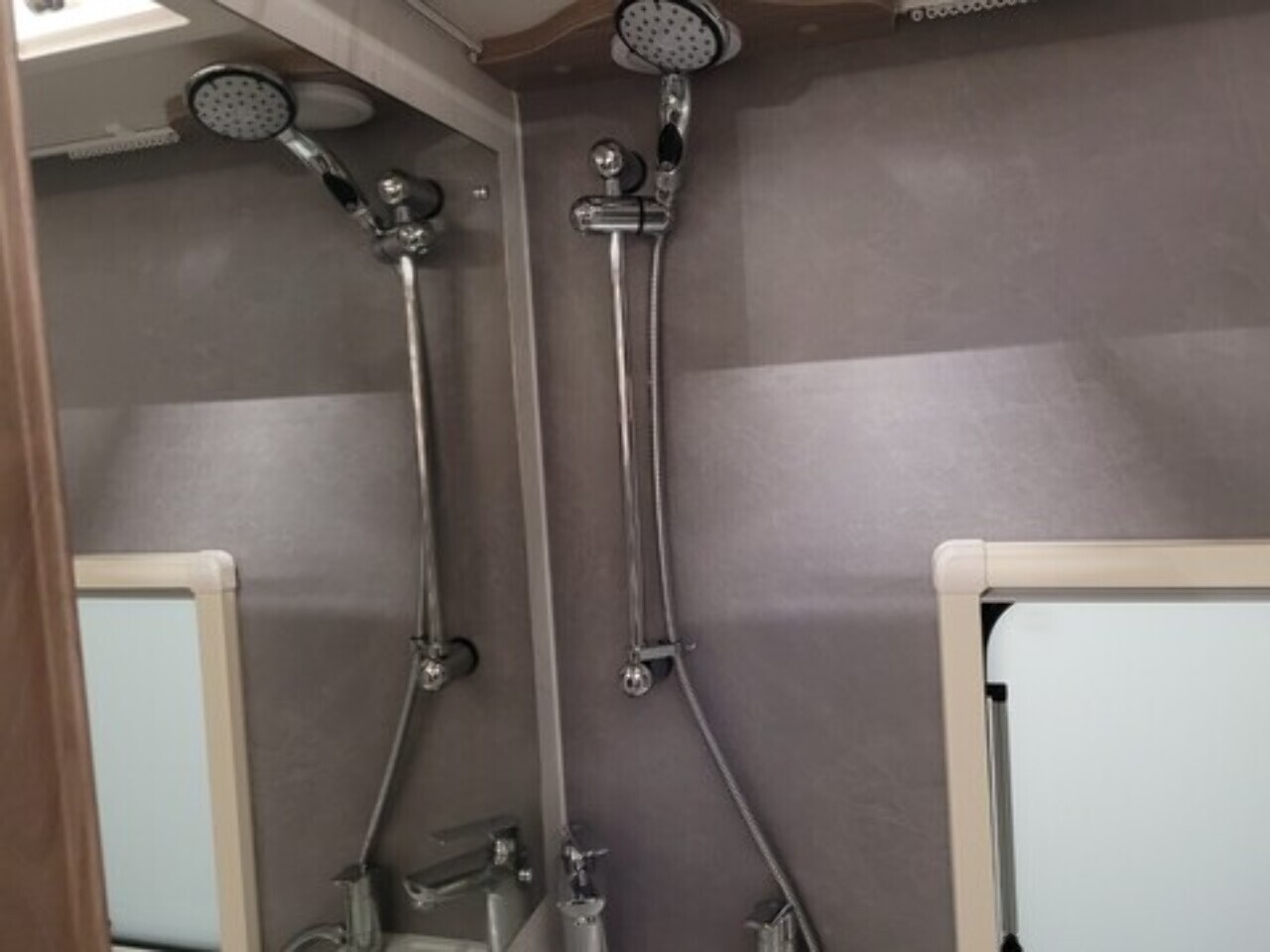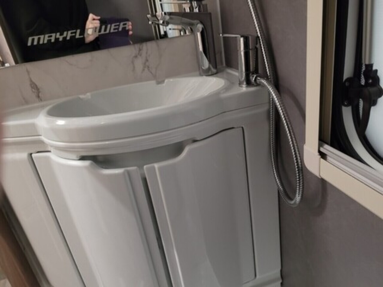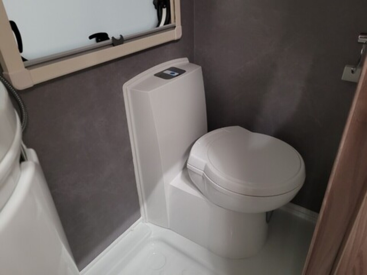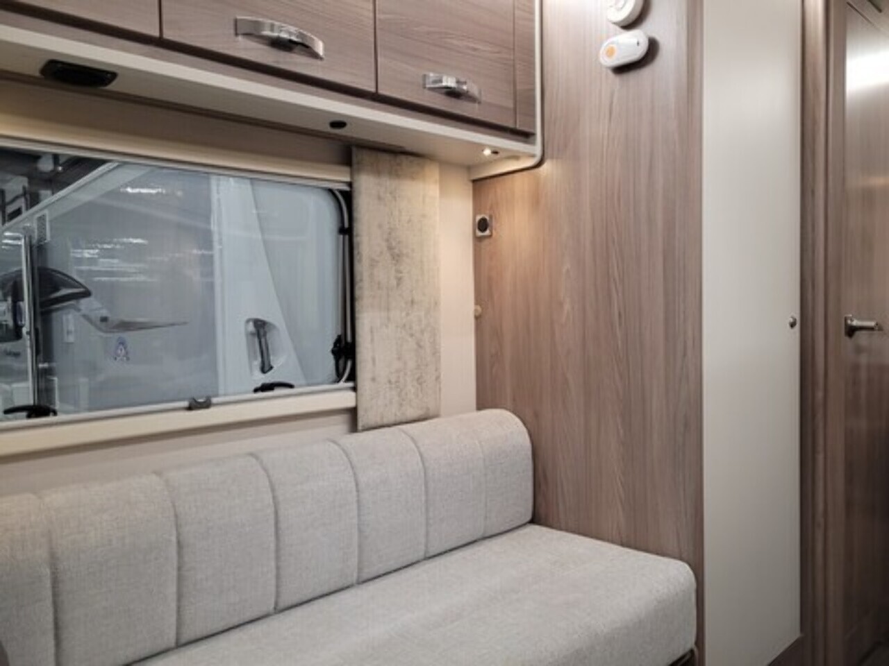 At the rear is the kitchen area, equipped with everything you need for your adventures. It includes a gas oven and grill, gas hob, microwave, and a kitchen sink with a lovely window view, so you can enjoy the scenery while cooking or washing up. Adacent to the kichen area you have the washroom which located to in the rear corner. That includes toilet, shower, and wash basin all in one convenient space perfect for compact touring without compromising comfort.