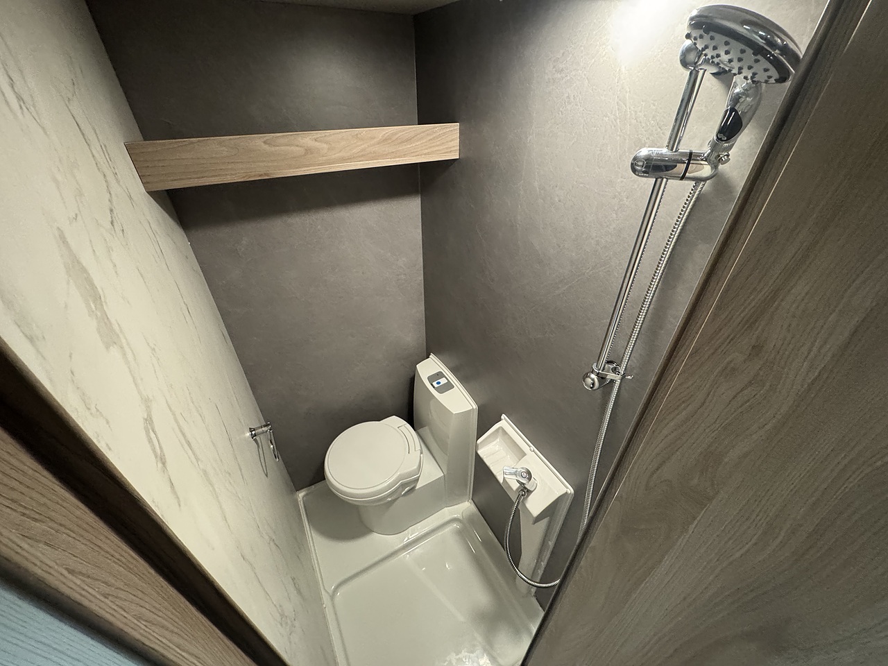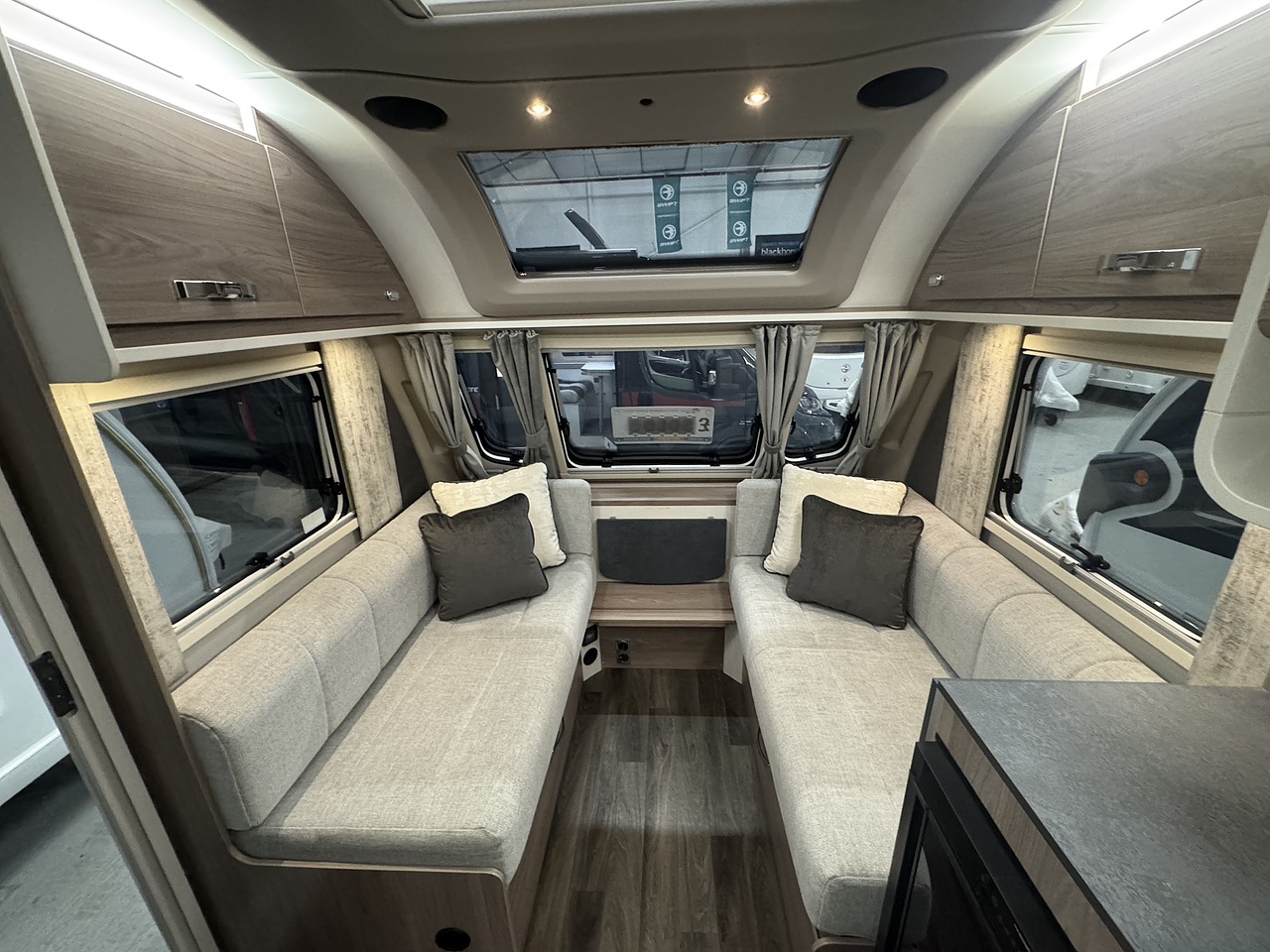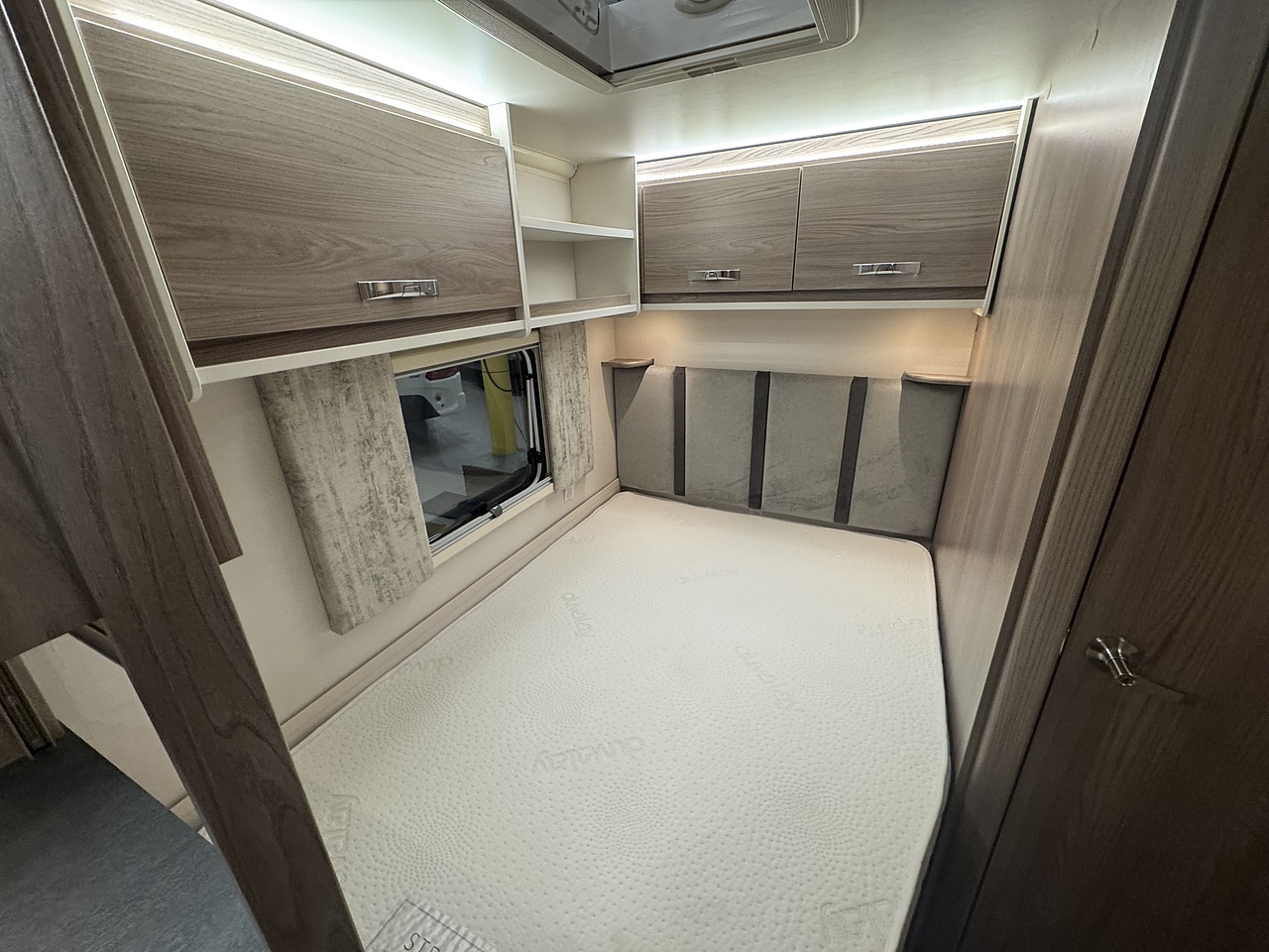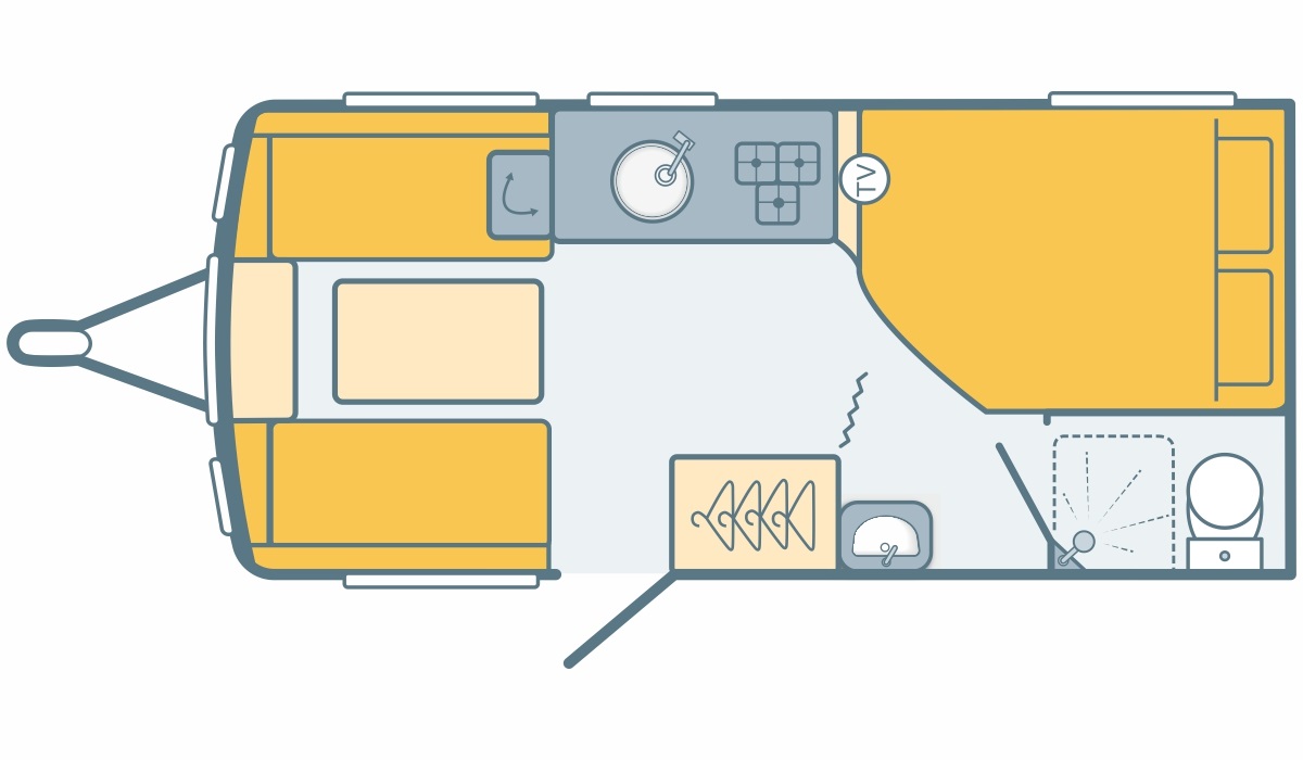 At the rear of the caravan, to the left-hand side, is a fixed double bed with a luxurious Duvalay mattress for a great night’s sleep. The bed also lifts to reveal handy under-bed storage, with overhead lockers providing even more space for your belongings. Next to the bedroom is the compact yet practical washroom, designed as a wet room with a toilet, shower, and wash basin, offering convenience without compromising on comfort.