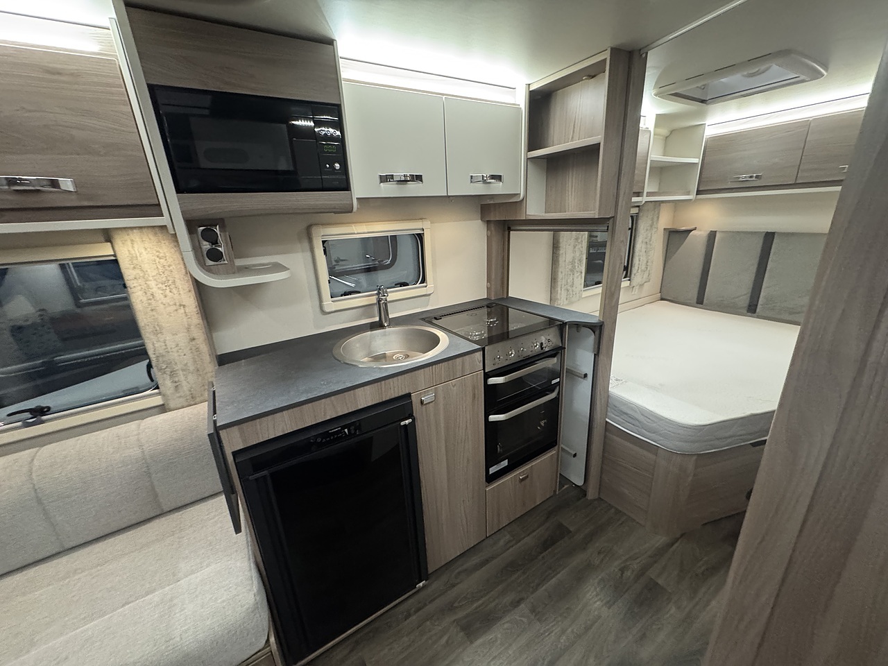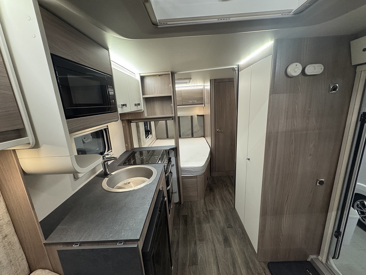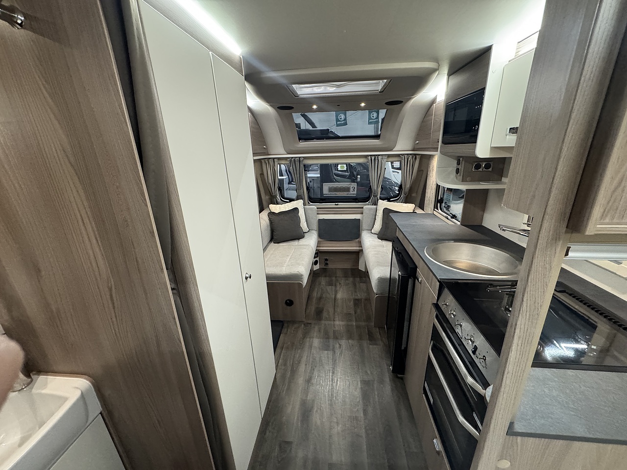 In the centre, there’s a well-equipped kitchen with everything you need for life on the road, including a microwave, fridge with freezer compartment, oven, grill, and three gas burner hob. Opposite the kitchen sits a full-height wardrobe, offering generous storage for clothing and essentials.