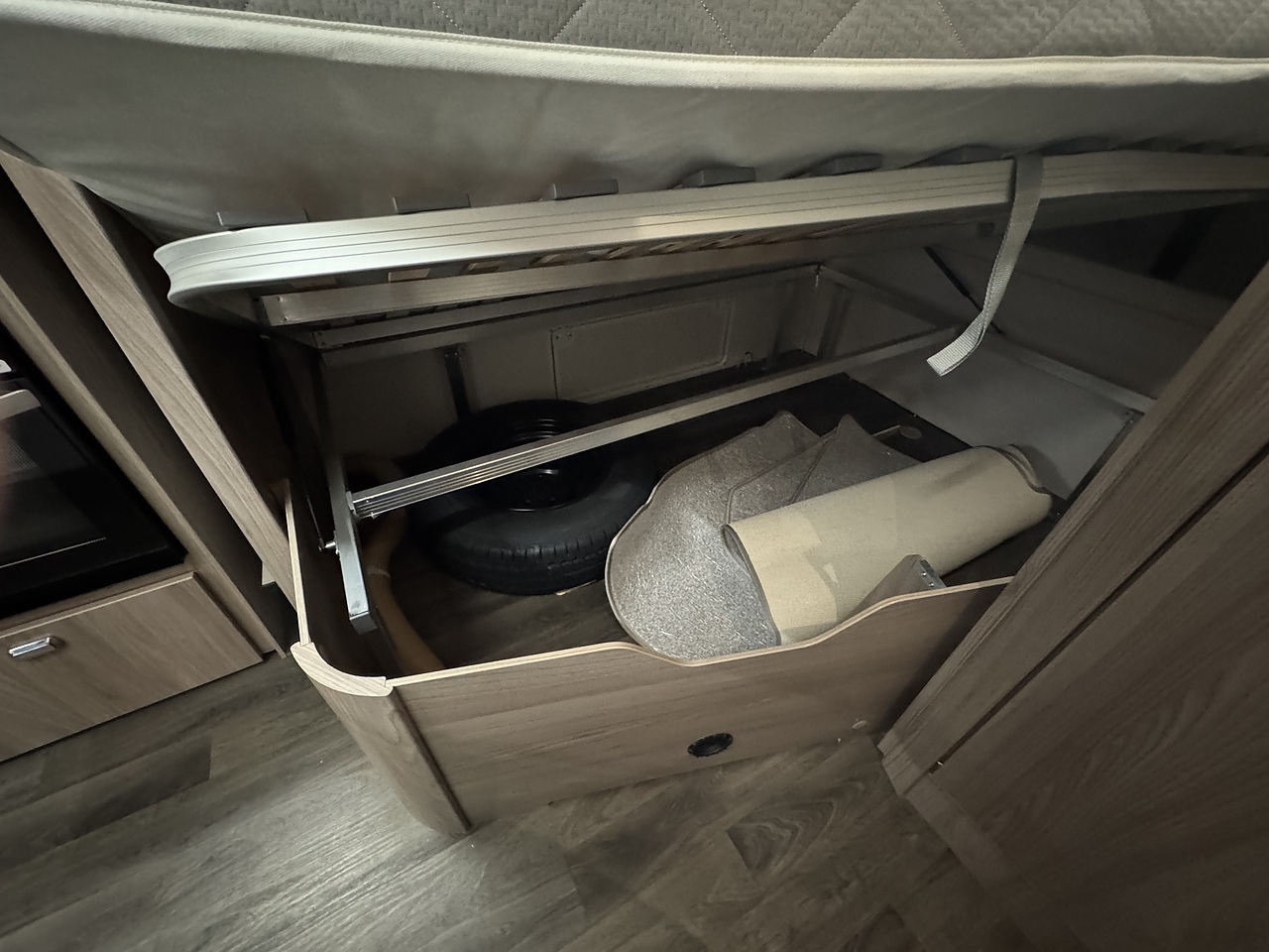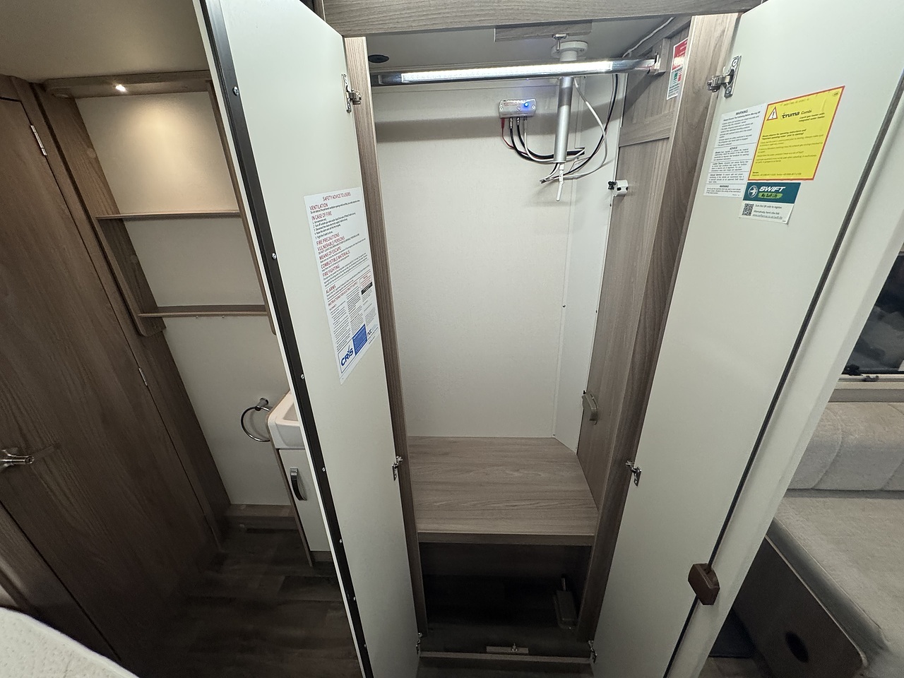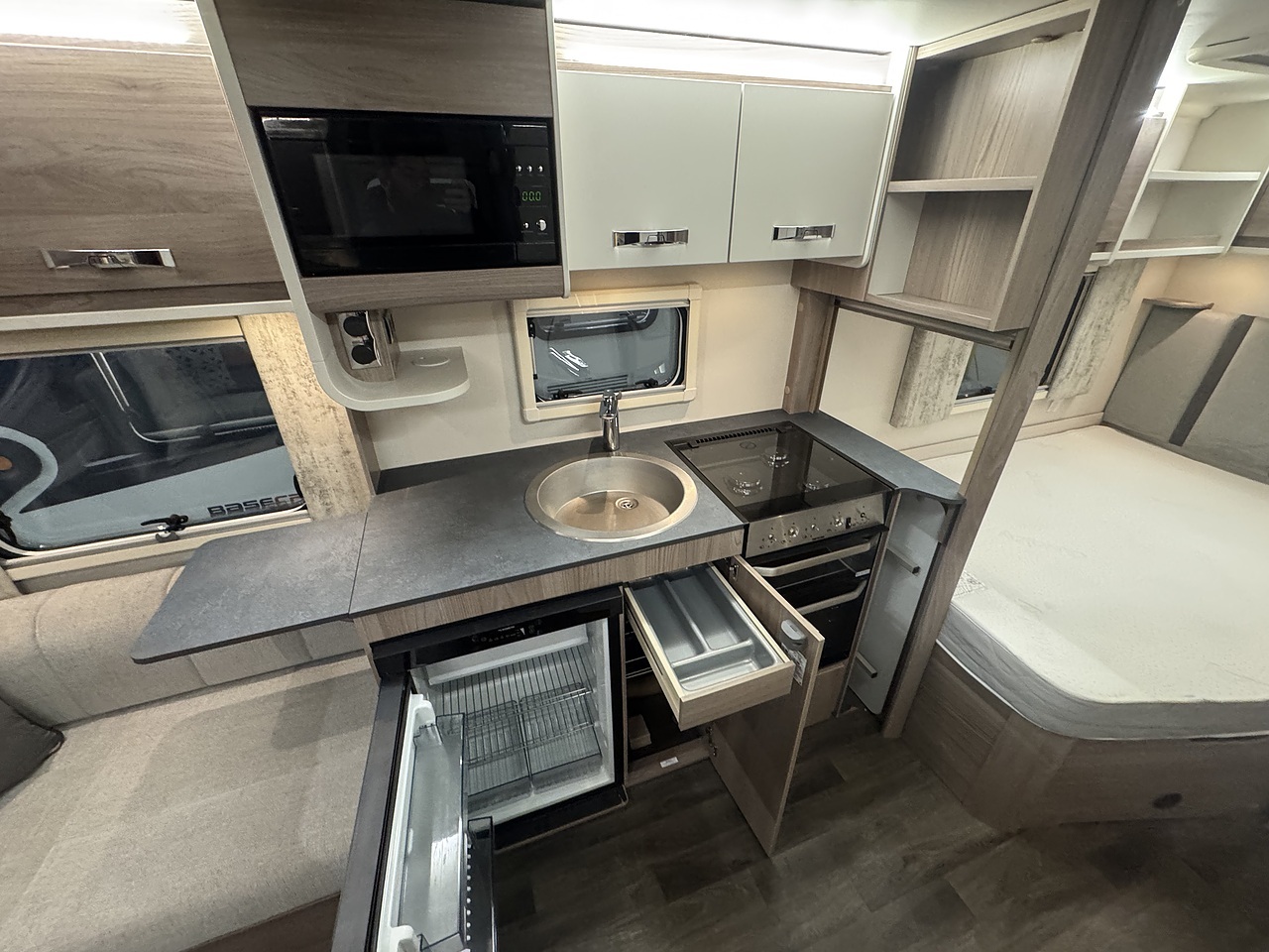 In the centre, there’s a well-equipped kitchen with everything you need for life on the road, including a microwave, fridge with freezer compartment, oven, grill, and three gas burner hob. Opposite the kitchen sits a full-height wardrobe, offering generous storage for clothing and essentials.